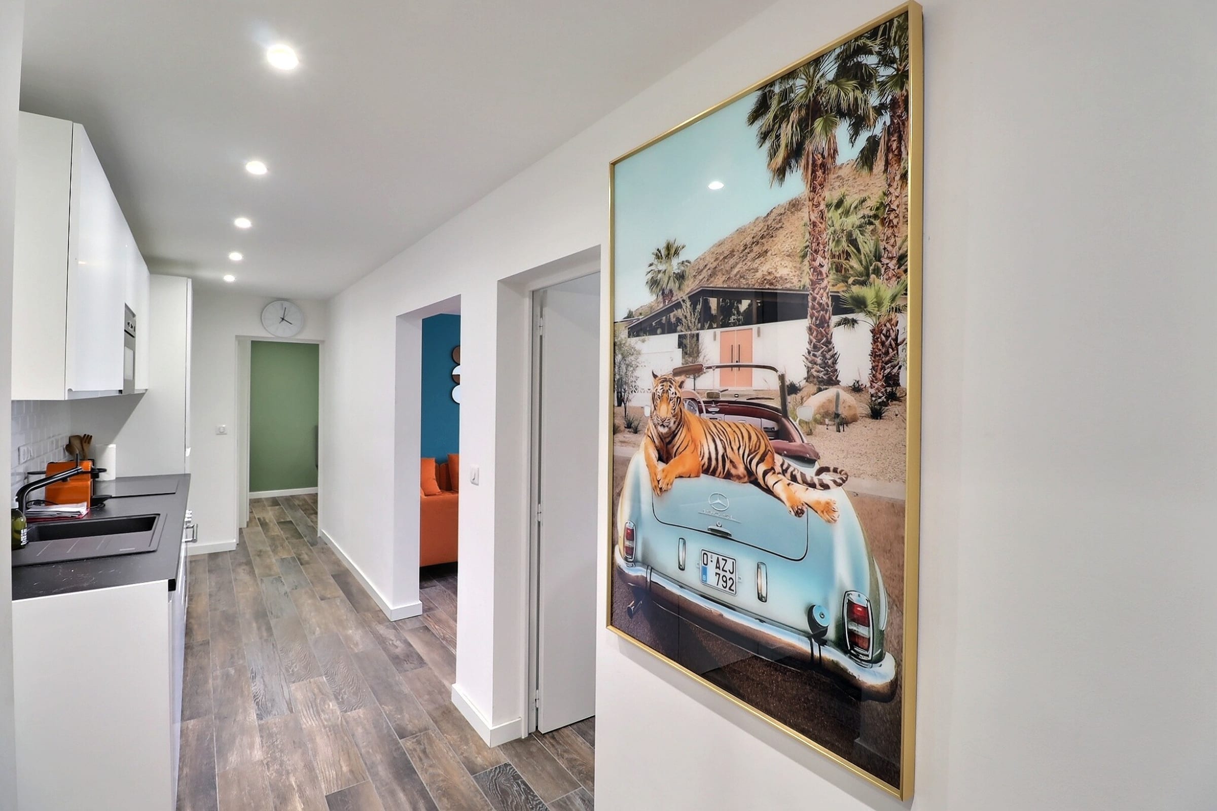 Pour vos nuits, l’appartement dispose de trois chambres indépendantes, chacune aménagée avec soin. Chaque chambre est équipée d’un lit double et d’un grand placard pour vos affaires. Une des chambres, véritable suite, dispose même d’une salle d’eau privative et d’un balcon, parfait pour commencer la journée en douceur.