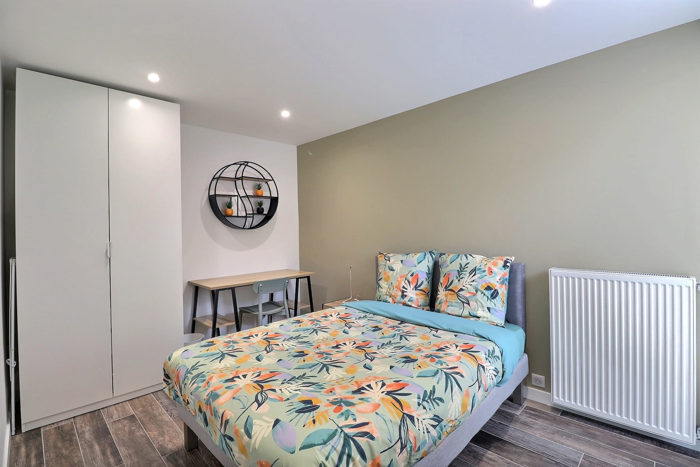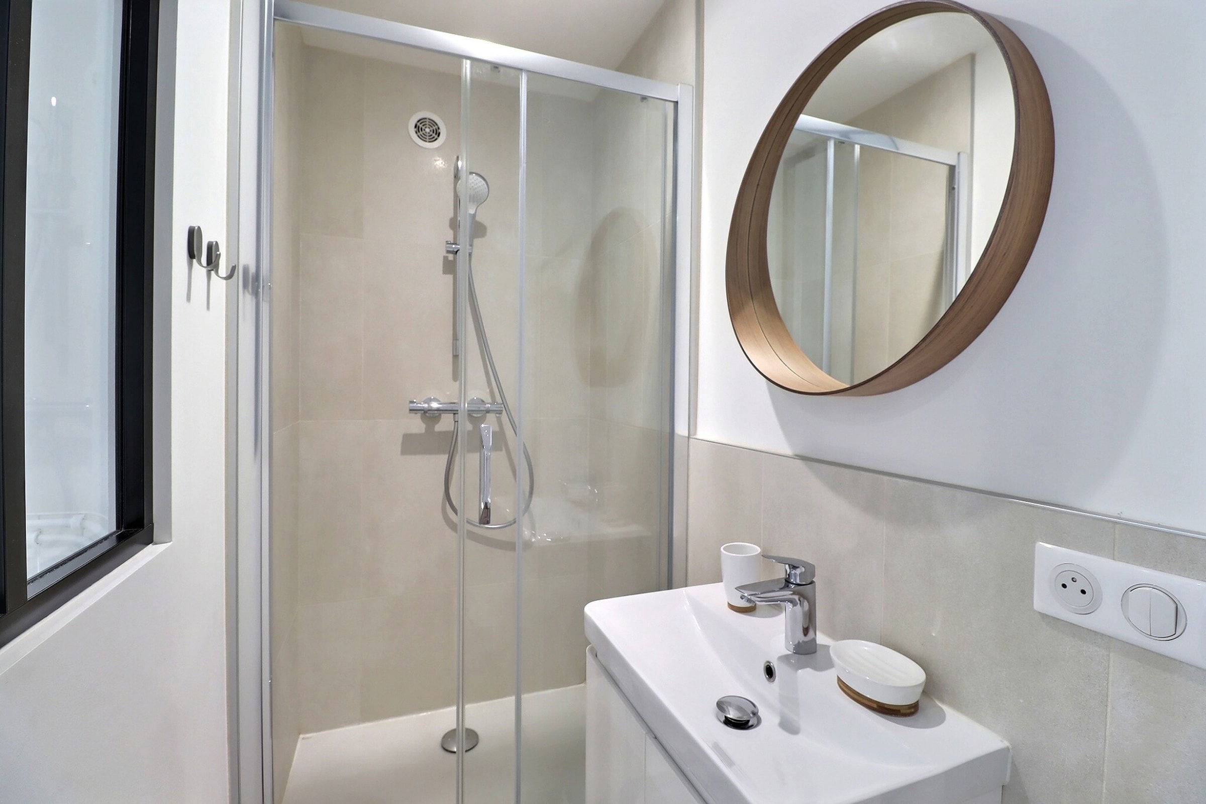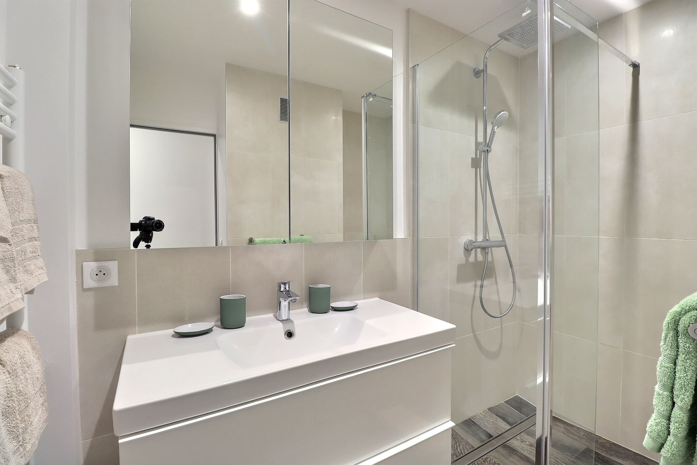 La salle de bain principale, moderne et fonctionnelle, est équipée d’une douche à l’italienne et d’un sèche-serviettes, tandis qu’un WC séparé complète l’espace pour plus de confort. Le linge de lit et les serviettes sont inclus pour que vous puissiez voyager léger.