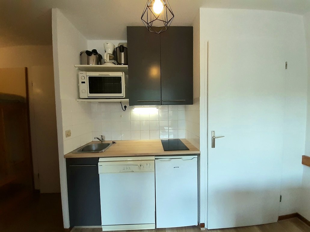 - La cuisine ouverte est équipée d'un four, d'un micro-ondes, de plaques vitrocéramiques (2 feux), d'un réfrigérateur et d'un lave-vaisselle