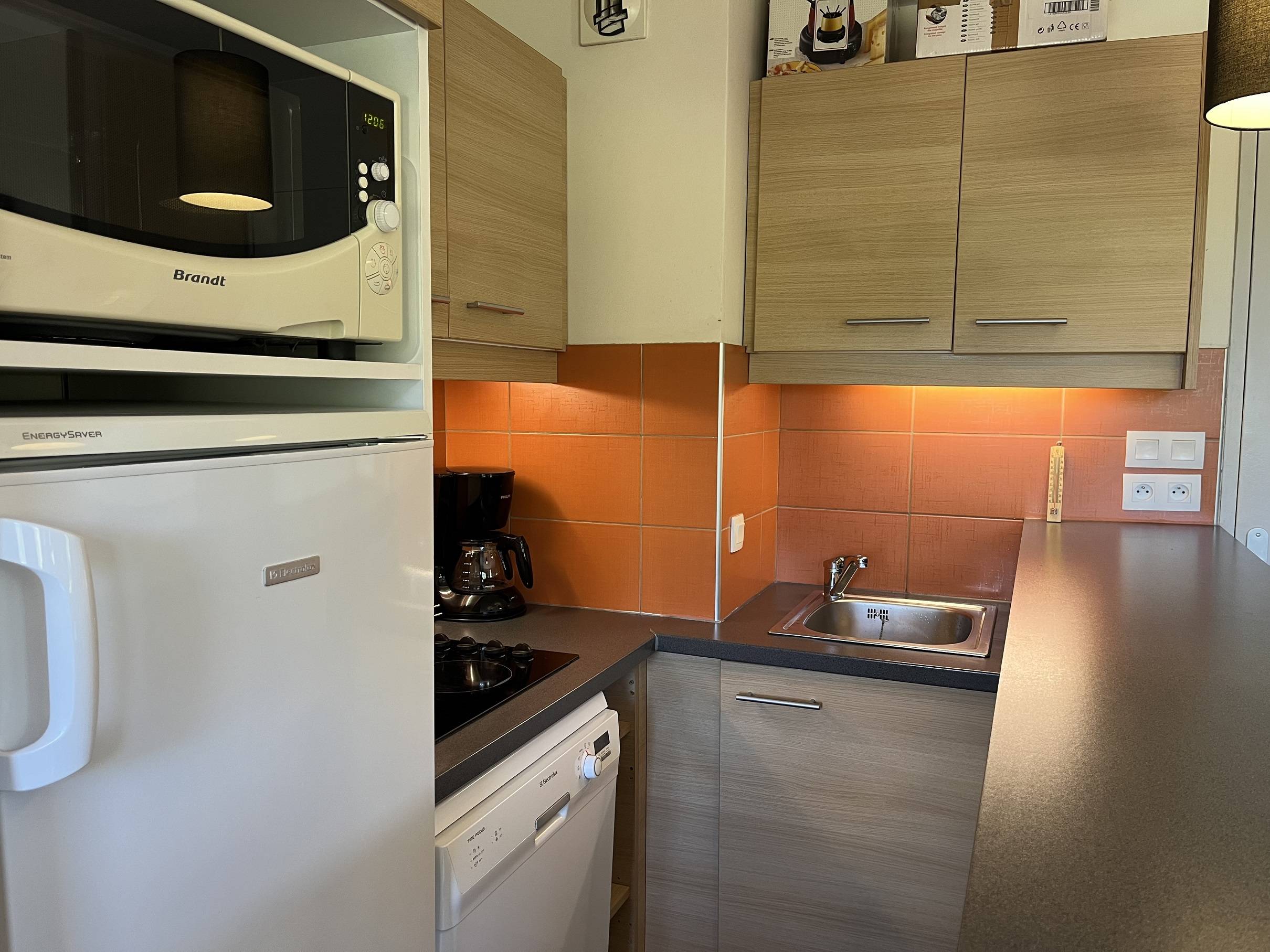 La cuisine, ouverte sur le séjour et entièrement équipée avec micro-ondes, réfrigérateur, plaques vitrocéramiques 4 feux, cafetière, grille pain, bouilloire ainsi qu'un appareil à fondue et à raclette.