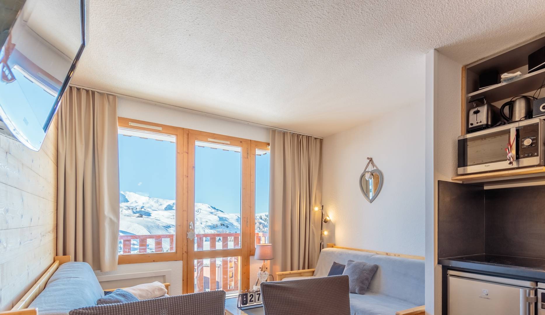 - Le séjour est équipé de deux lits simples (2 personnes - 80*190) et d'un téléviseur. Il donne accès au balcon d'où vous profiterez d'un bel ensoleillement et d'une vue dégagée sur les montagnes !