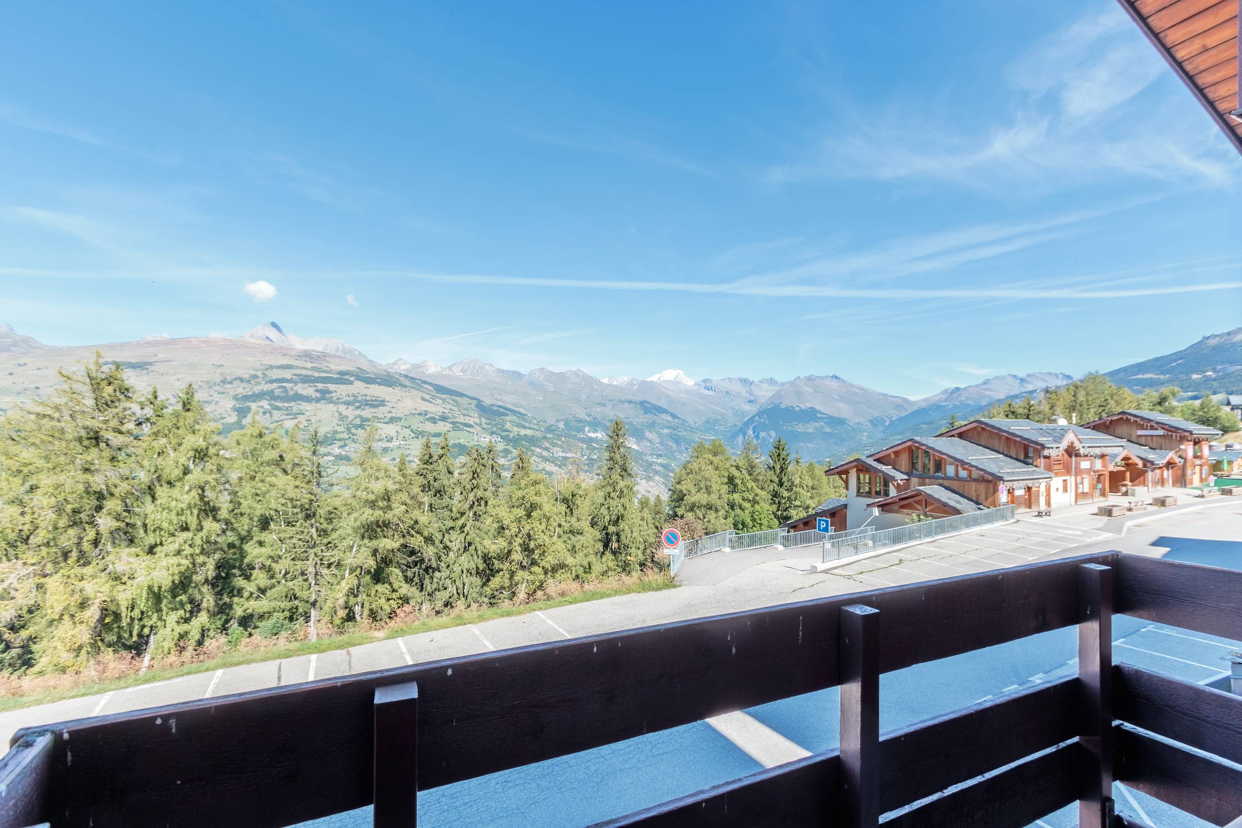 Le balcon avec vue sur le Mont Blanc est exposé Nord. Le casier à skis est dans la résidence.