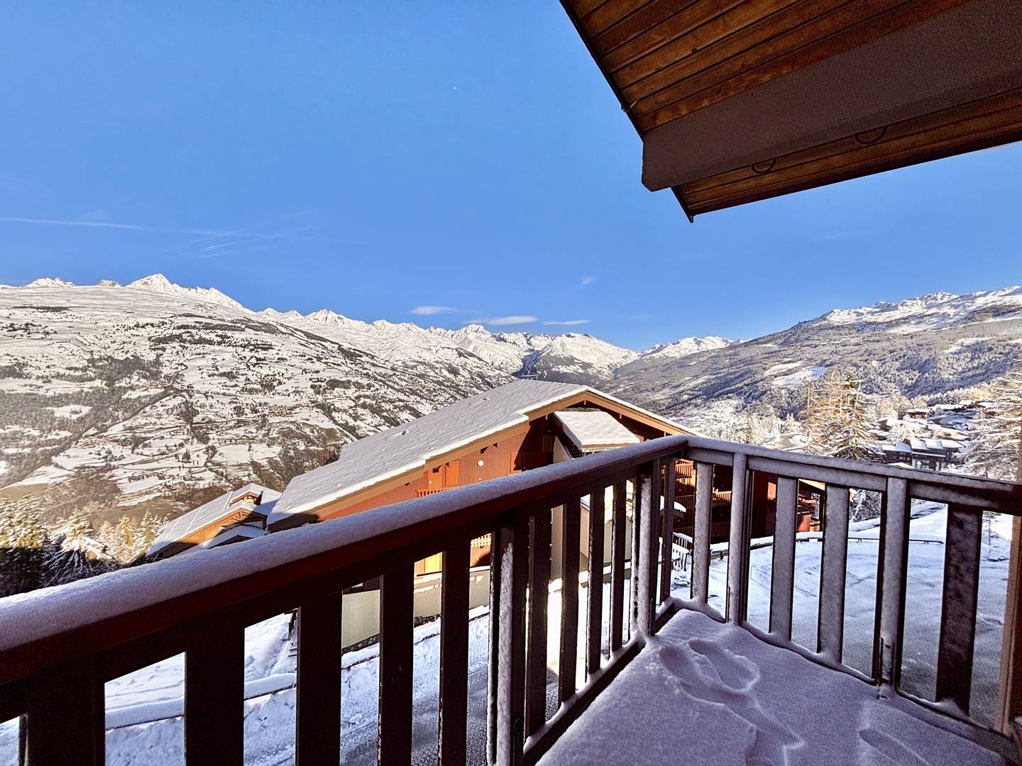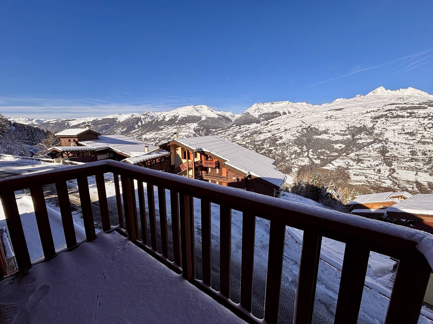 Le balcon avec vue sur la vallée est exposé Nord-Ouest. Le casier à skis est dans la résidence.