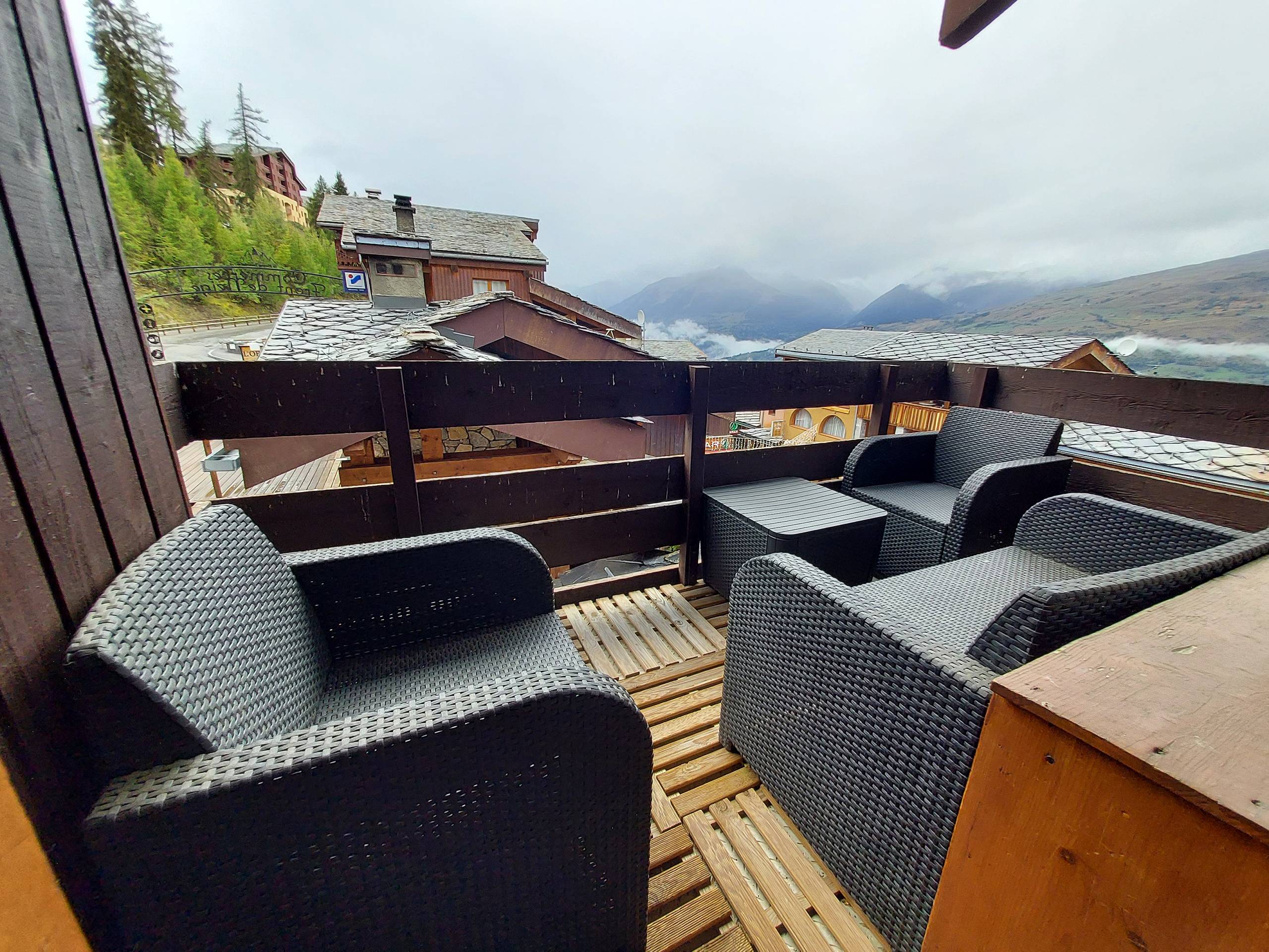 Il a une vue sur la place des Commerces et est exposé Ouest. Le casier à skis est dans la résidence.