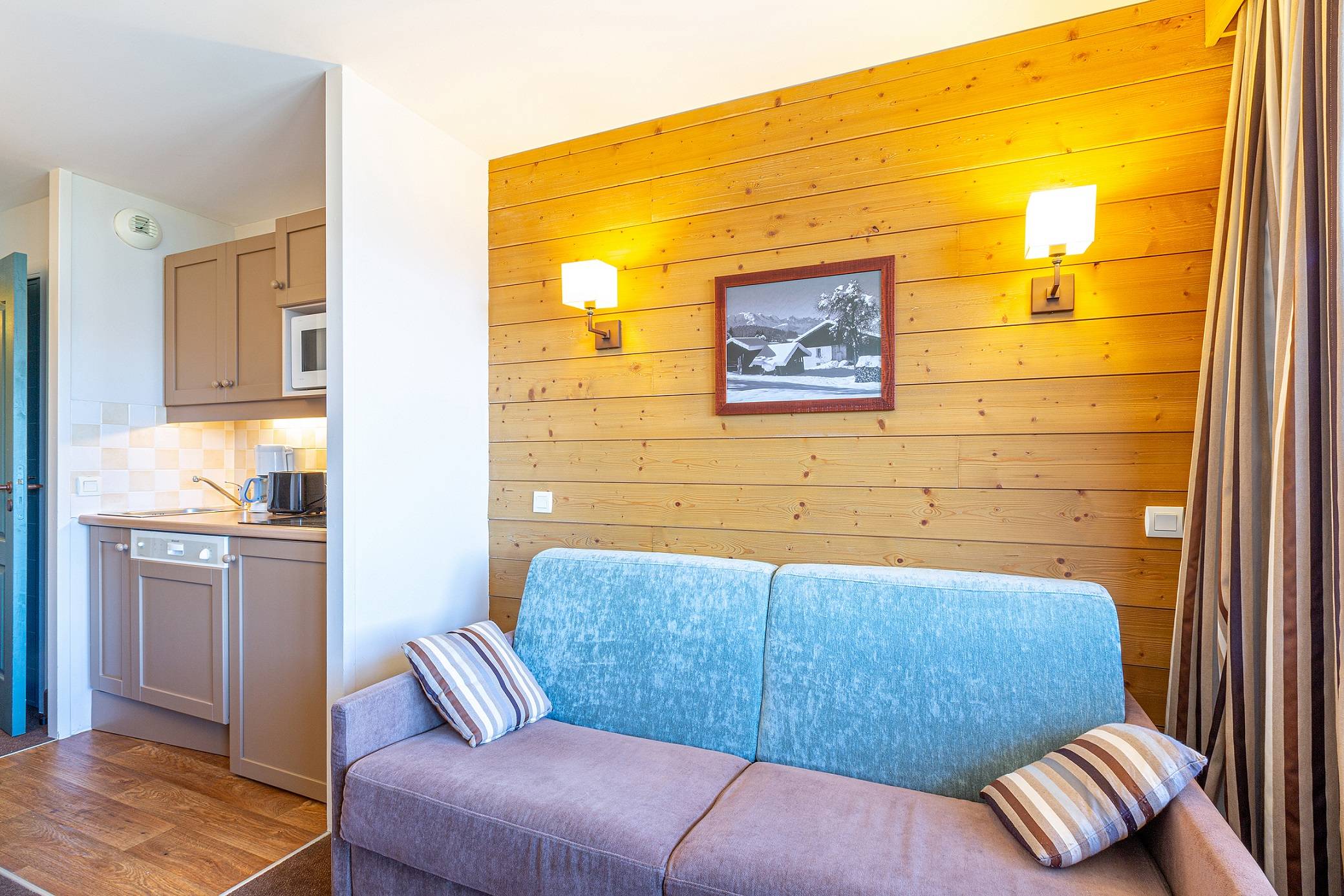 La marelle est située aux abords de la piste menant sur Montchavin. Un arrêt navette est directement accessible et vous permettra de relier très facilement le centre station. Les appartements en exposition Nord offrent une vue panoramique sur la vallée et le Mont Blanc.