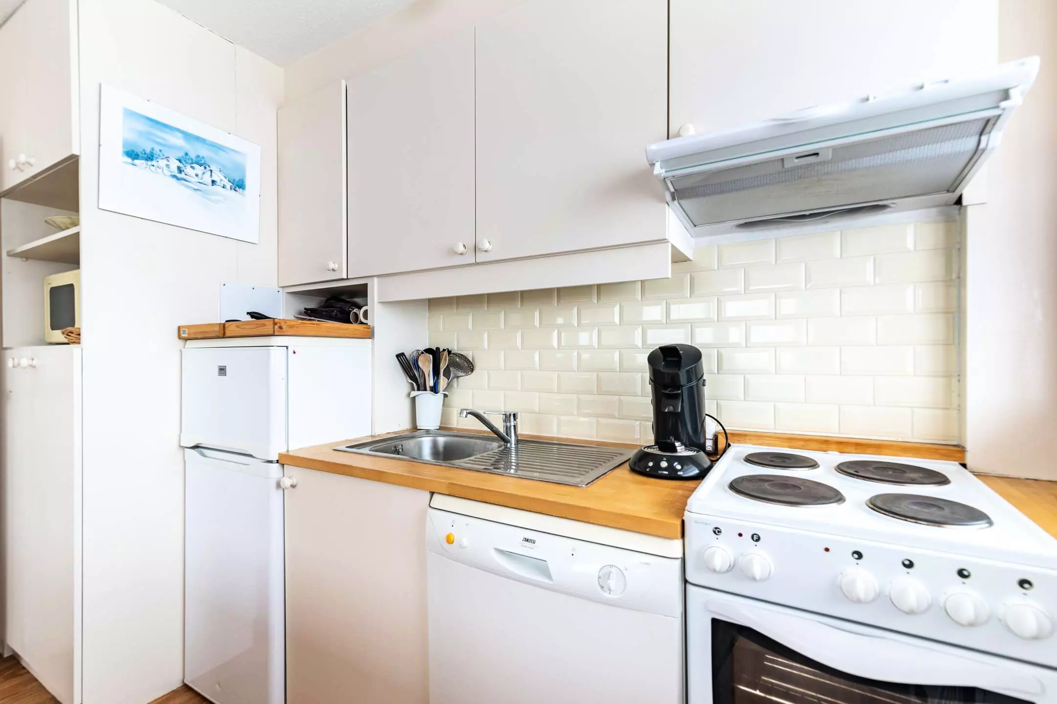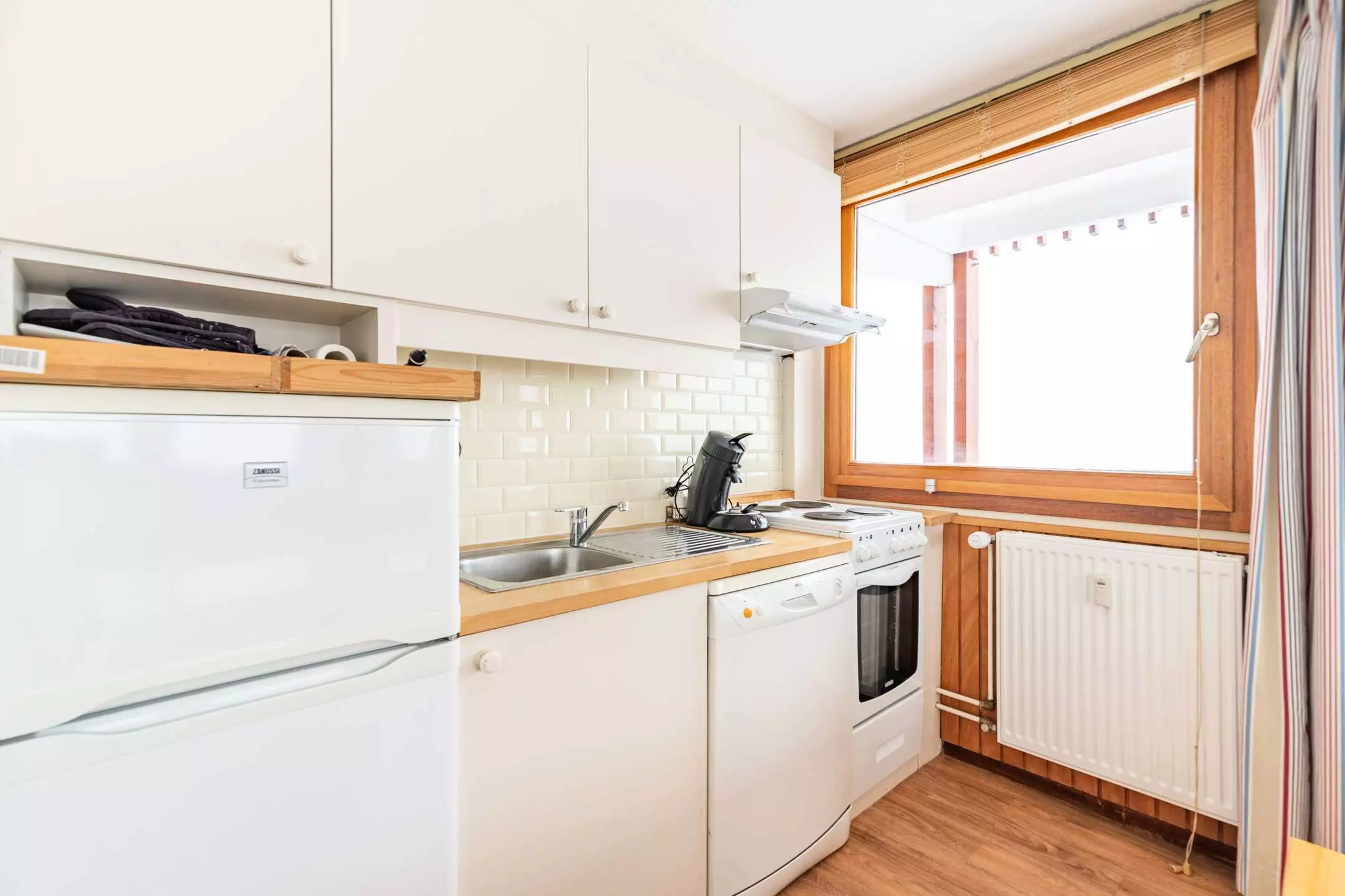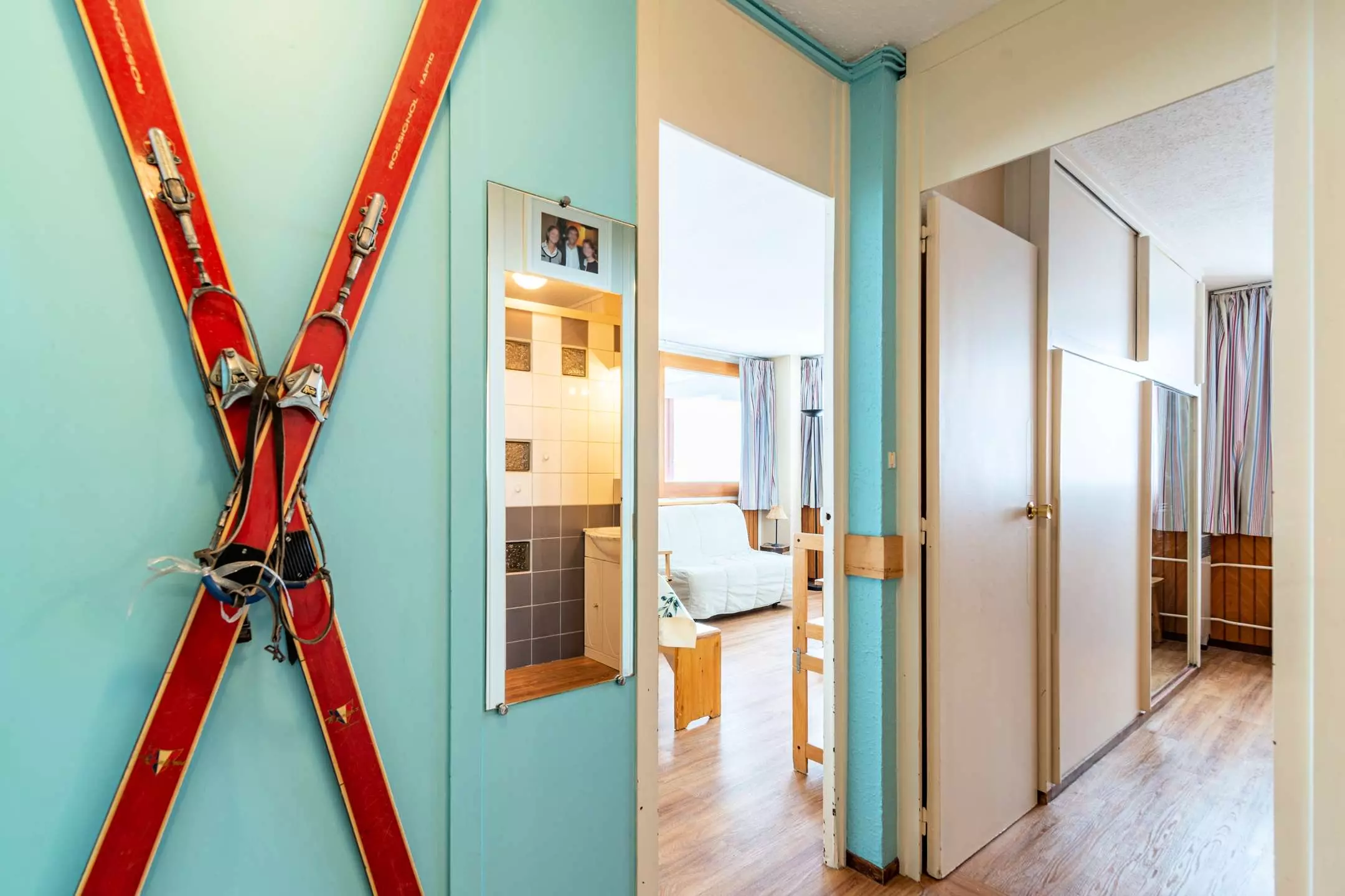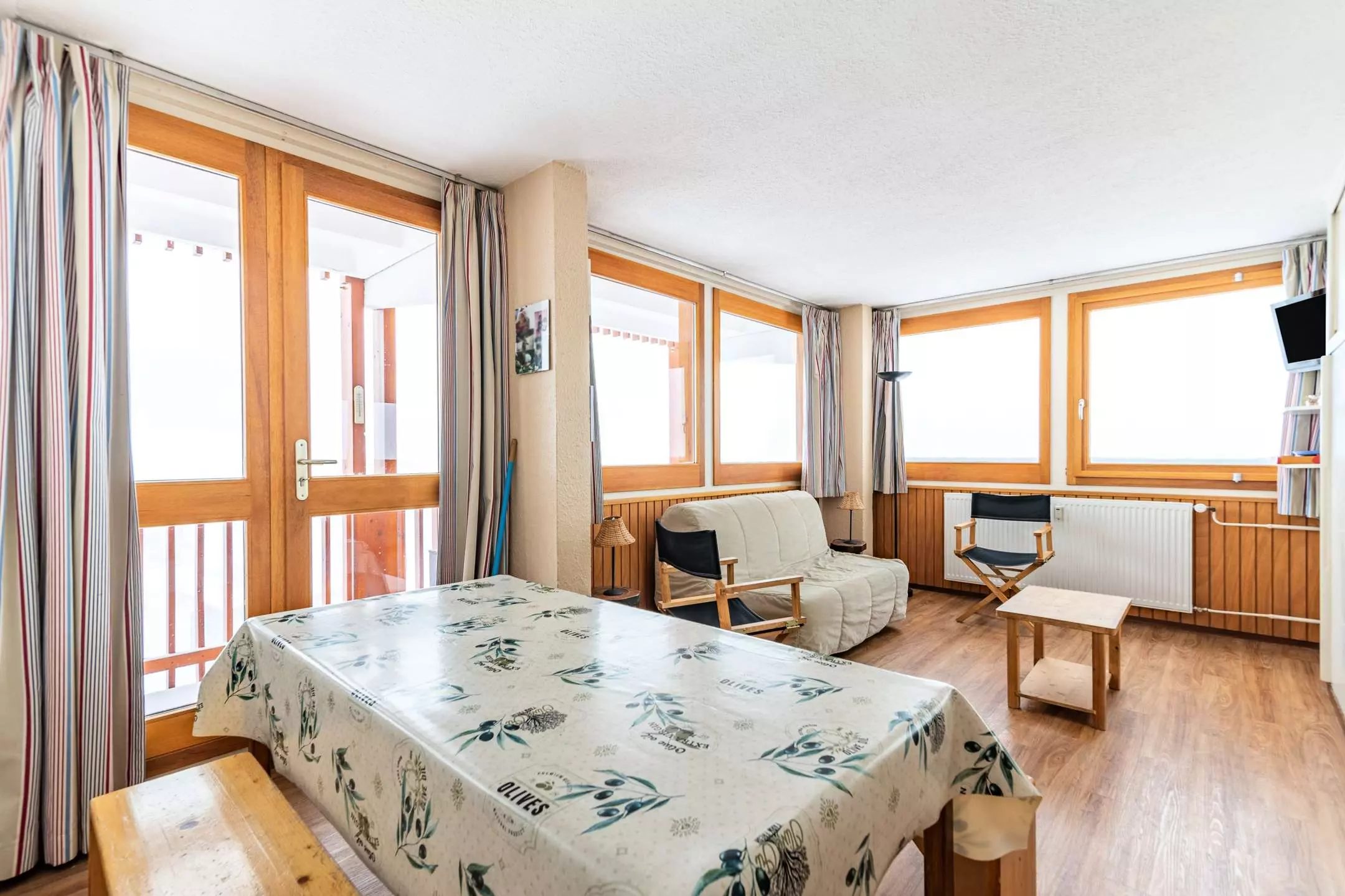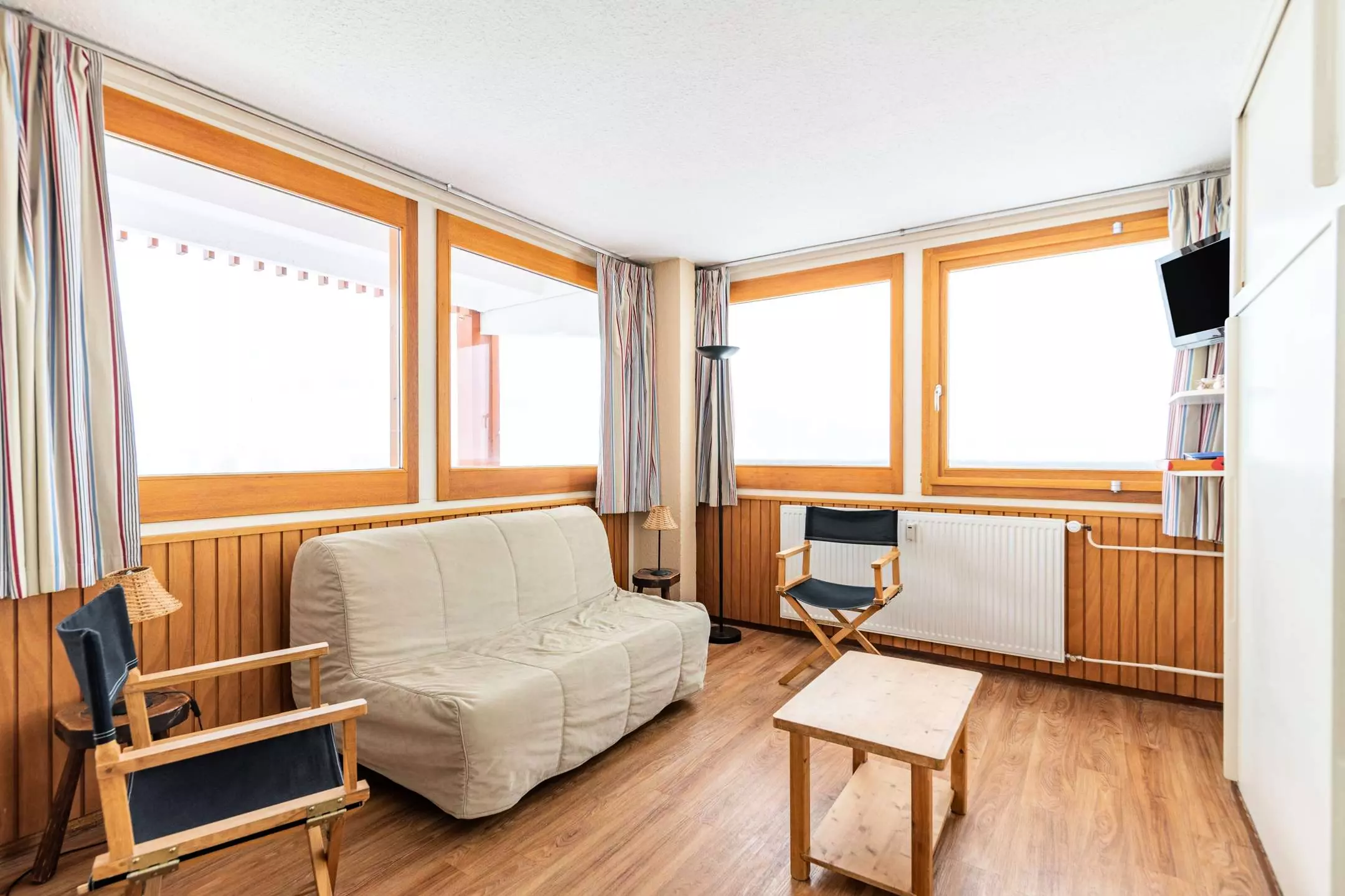 Appartement 2 pièces, 5 pers., 43m2, Balcon exposé Ouest/Nord, vue sur la station et pistes - 12ème étage avec ascenseur Cuisine dans séjour : 4 plaques électriques sur cuisinière, réfrigérateur, four micro-ondes, lave-vaisselle, cafetière électrique, senseo (dosettes non fournies) - Séjour : 1 canapé-lit BZ 2 pers, coin repas, TV- Chambre : 2 lits superposés, 1 lit 1 pers - Salle de bains : douche - WC séparés Les sols : plastique. Literie : couettes - . Appartement non fumeur, animaux non admis. En option et en supplément: Ménage de fin de séjour, draps, serviettes, forfaits ski.