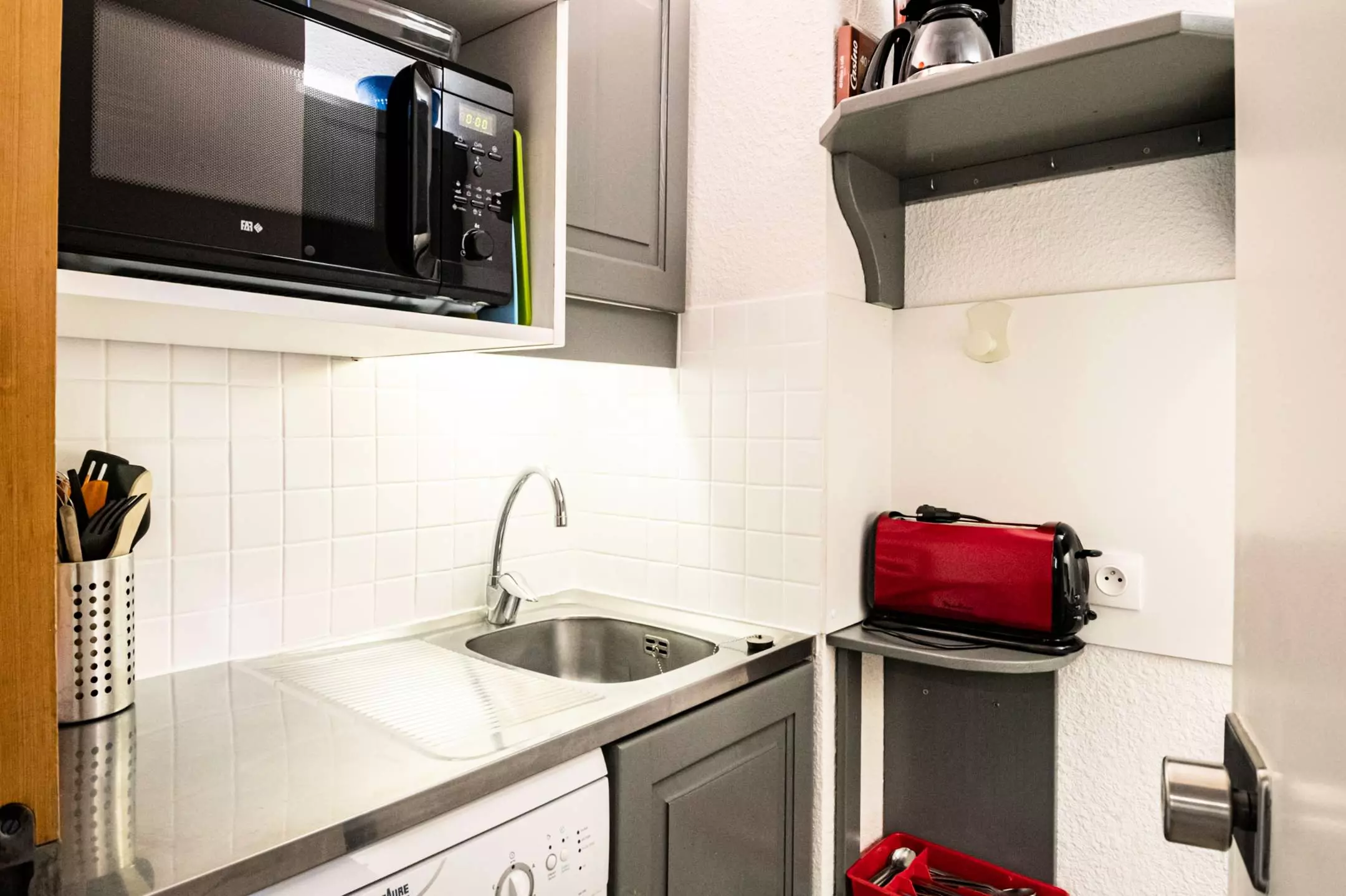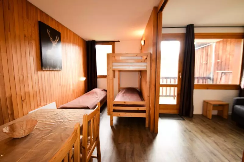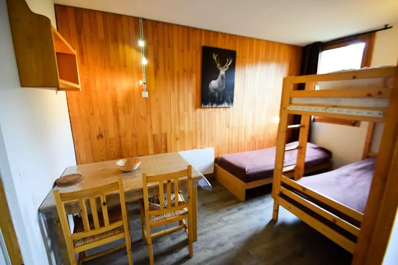 Studio divisible, 4/5 pers, 26m2, exposition Sud, vue sur les pistes, Balcon - 2ème étage sans ascenseur - Cuisine : 2 plaques électriques, réfrigérateur., four micro-ondes, lave-vaisselle - Séjour : coin repas, canapé-lit 2 pers rapido 140cm, TV- Partie divisible : (avec cloison coulissante) 2 lits superposés 1 pers, 1 lit 1 pers - SDB : baignoire - WC séparés -Literie : couettes (1x 220/240, 3x140/200). - Casier à skis N° 26 au RDC. Ménage de fin de séjour, draps, serviettes et forfaits ski en option. Appartement non fumeur, Animaux non admis WIFI INLCUS Petite résidence composée de 3 étages, calme, AU PIED DES PISTES, à environ 700m des commerces : accès par navettes en bus gratuites - parking extérieur gratuit à proximité de la résidence - Plagne Villages est reliée à Plagne Centre par le télébus (télécabine gratuite)