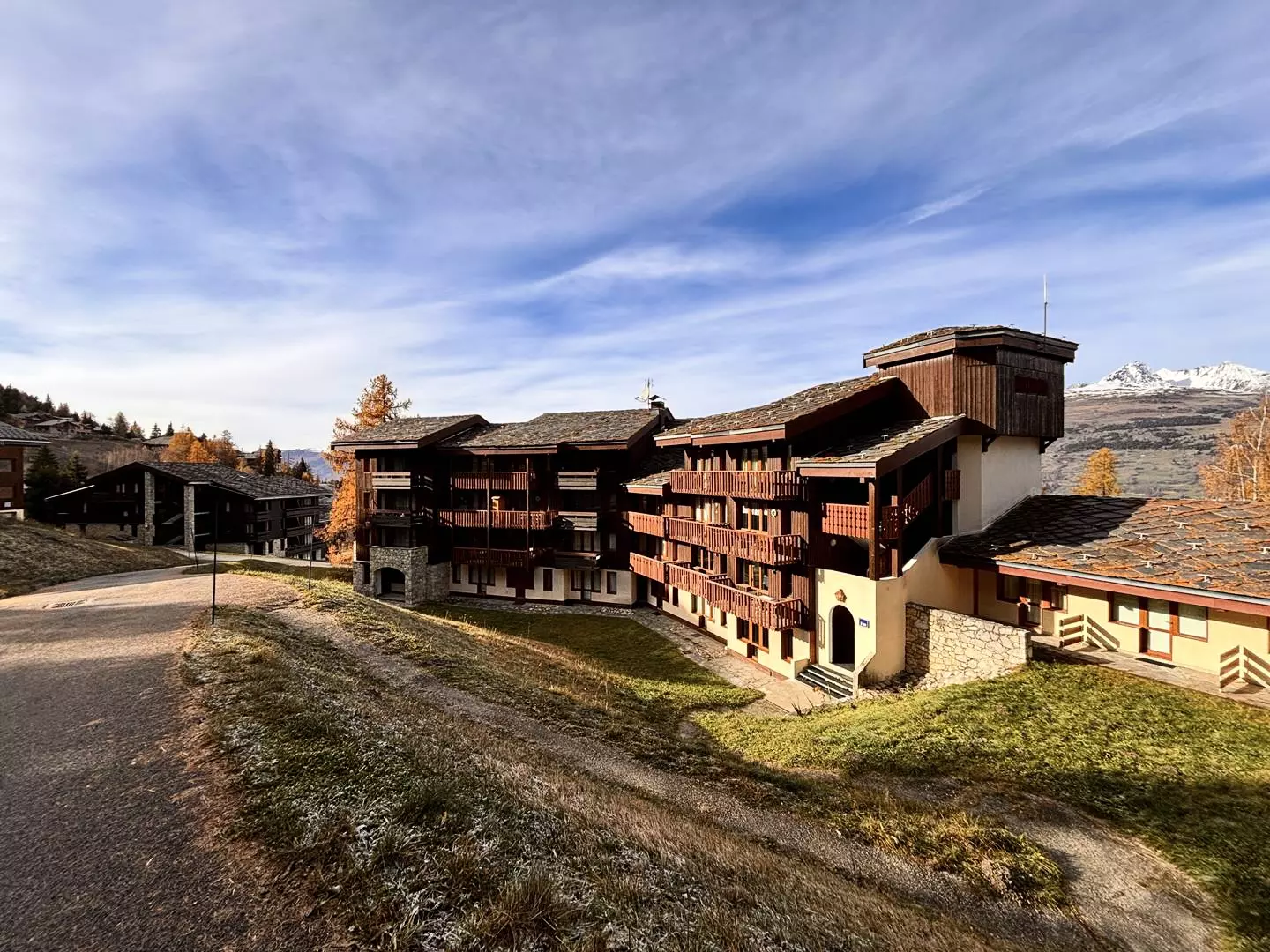 Les 2 balcons avec vue sur les montagnes sont exposés Nord. Le casier à skis est dans la résidence.