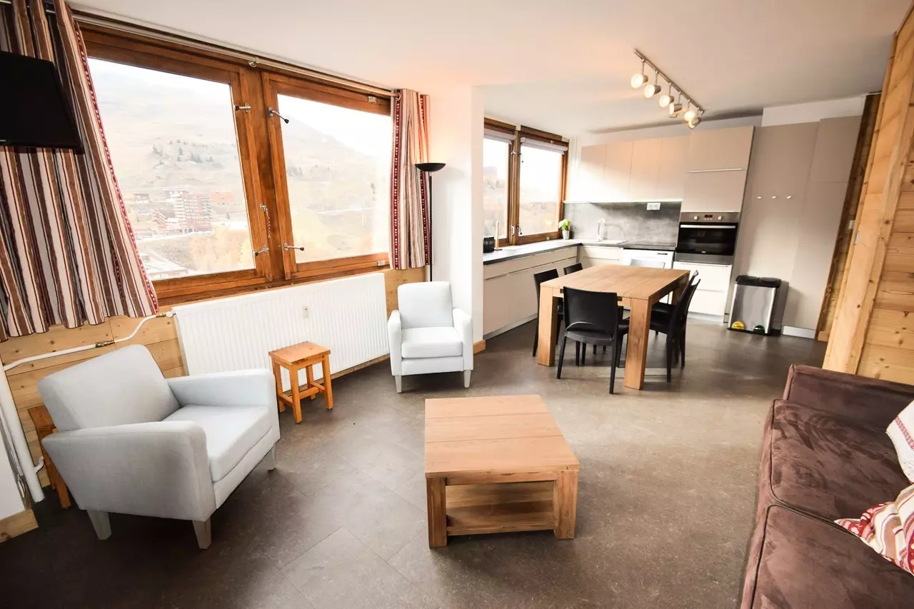 Bel Appartement de 3 pièces pour 6 pers, 61m2, exposé plein Sud et S/O, vue sur les pistes, avec balcon, au 7ème étage avec ascenseur, Cuisine ouverte : plaques vitro-céramiques, four traditionnel + four micro-onde , réfrigérateur, lave-vaisselle. Séjour : coin repas, coin salon, Chambre 1 : 2 lits 1 pers 80x200 et 2 lits superposés - Chambre 2 : 1 lit double 160x190cm - SDB : douche, WC séparés - Literie : couettes - .Sols : pvc sauf moquette dans chambres - Appartement non fumeur, animaux non admis. En option et en supplément: Ménage de fin de séjour, draps, serviettes, forfaits ski.