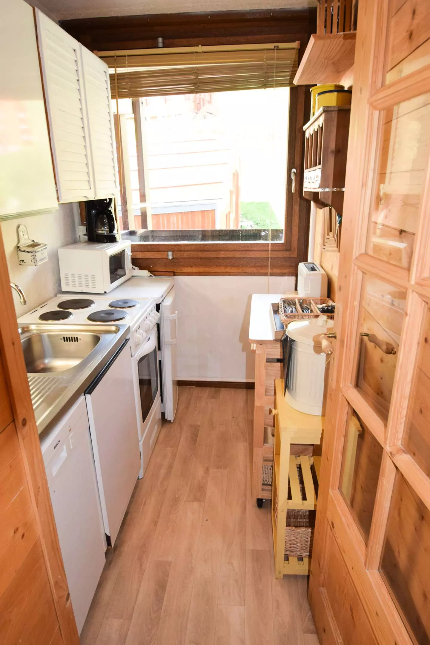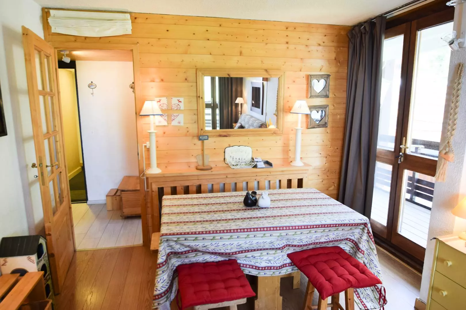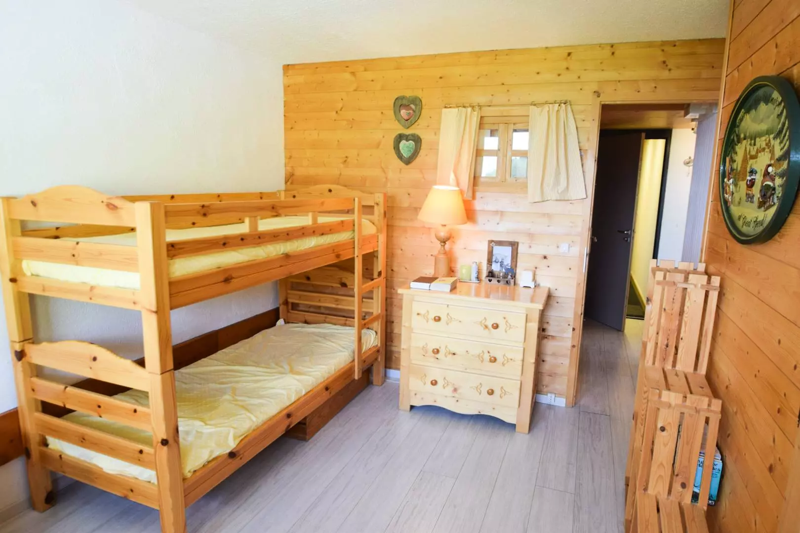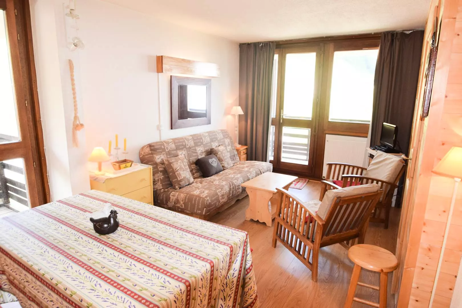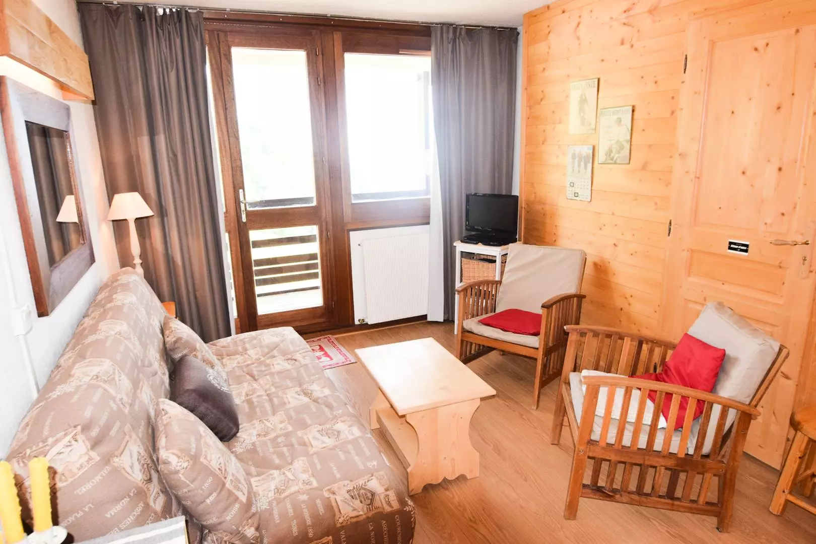 Appartement 2 pièces, 5 pers : 40m2, expo ouest/nord, vue mont blanc et vallée, 2 balcons, 4ème étage avec ascenseur. Cuisine séparée : 4 plaques électriques, réfrigérateur, lave vaisselle, four traditionnel, micro-ondes. Séjour : 1 canapé-lit 2 pers, TV. Chambre : 2 lits superposés et 1 lit 1 pers - Salle de bains : baignoire. WC séparés. Literie : 3 couettes simples et 1 couette double -Appartement non fumeur, animaux non admis. En option et en supplément: Ménage de fin de séjour, draps, serviettes, forfaits ski.