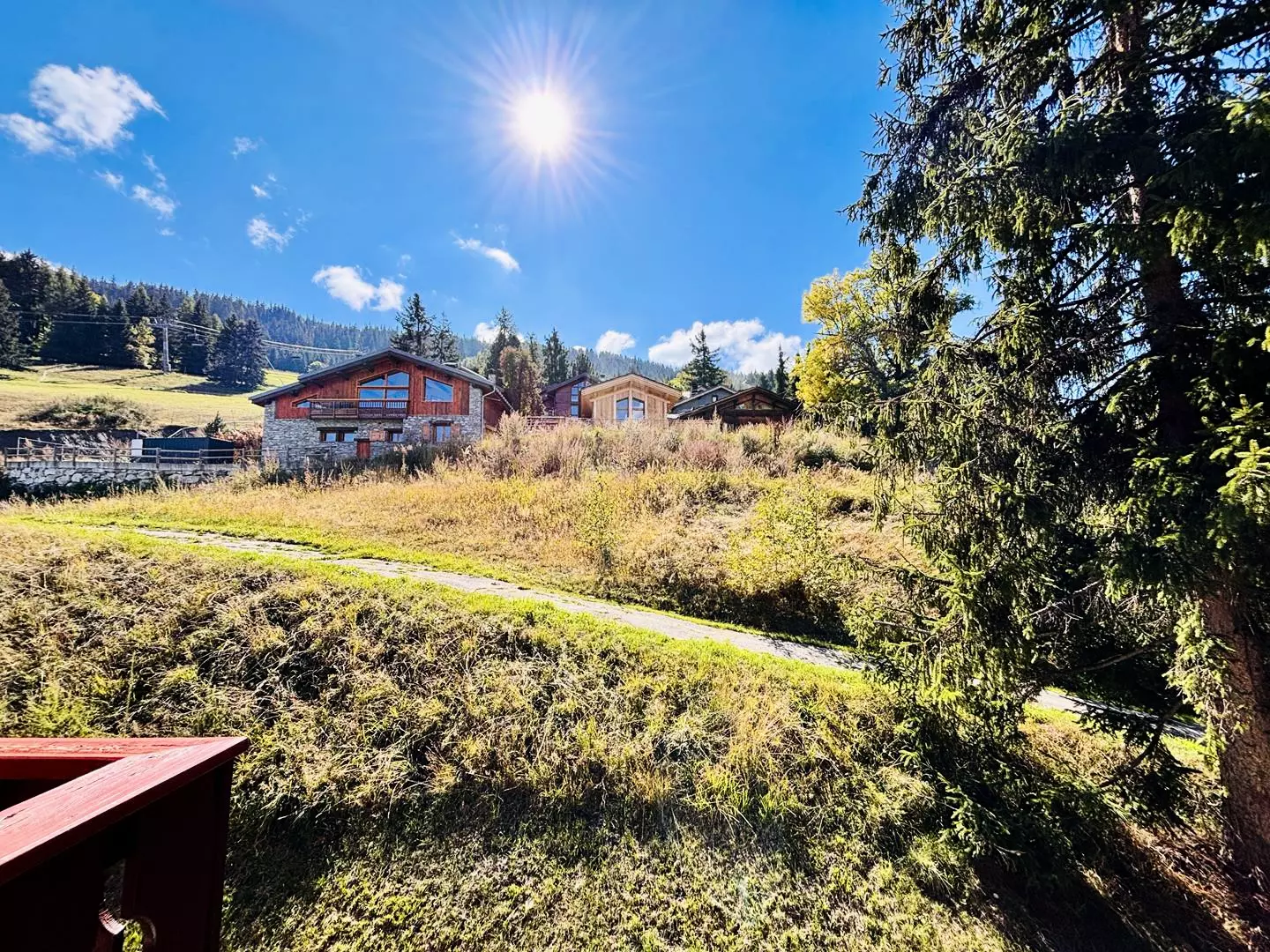 Un Balcon exposé Sud avec vue sur des chalets et sapins. Le casier a ski est dans la résidence.
