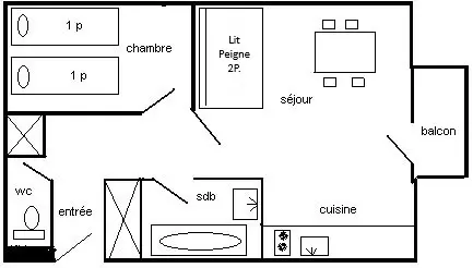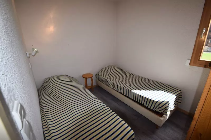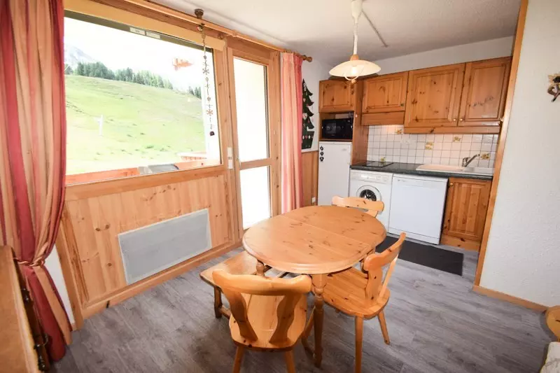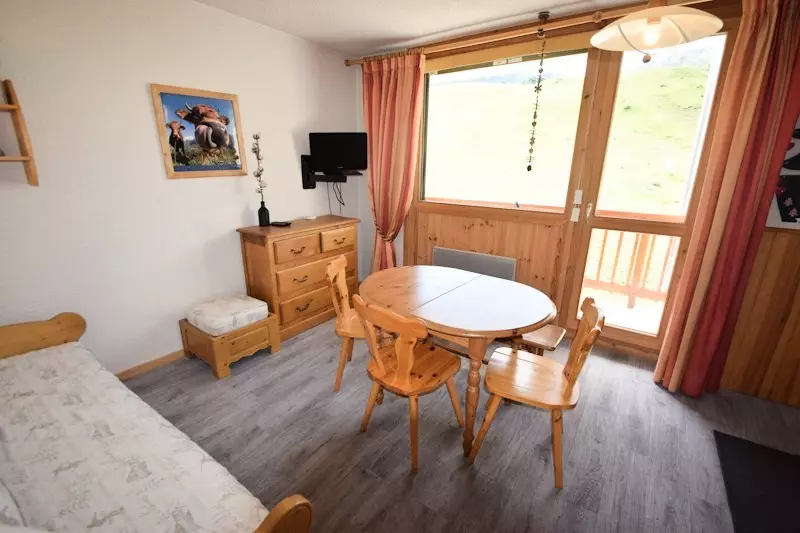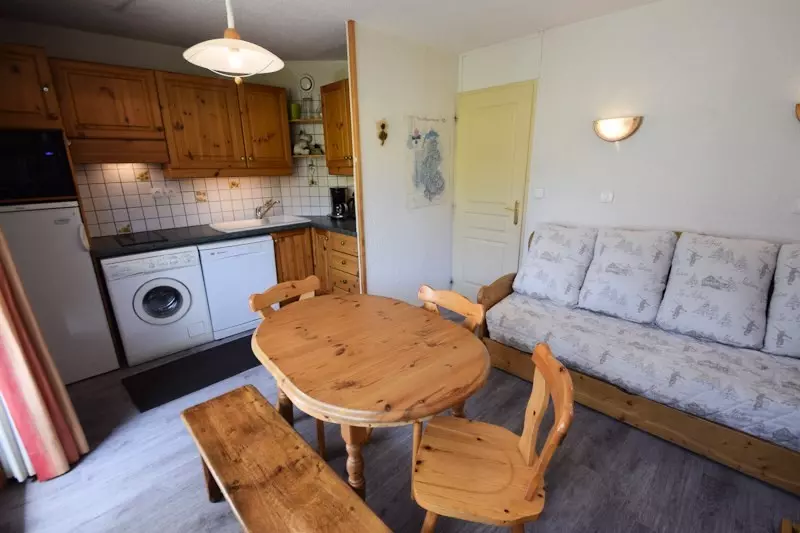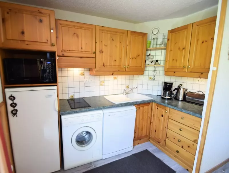 Petit 2 pièces 4 pers 28m2, balcon exposition Sud, vue sur les pistes, 3ème étage, ascenseur - Cuisine : 2 plaques vitro-céramiques, Lave-vaisselle, lave-linge, réfrigérateur, four mixte, cafetière électrique - Séjour : coin repas, 1 canapé lit 2pers lit peigne. TV - Chambre : 2 lits simples. SDB : baignoire, WC séparés.- Literie : 2 couettes 1p et 1 couette 2p - Les sols : moquette. En option et en supplément : ménage de fin de séjour, draps, serviettes, forfaits ski. ANIMAUX NON ADMIS