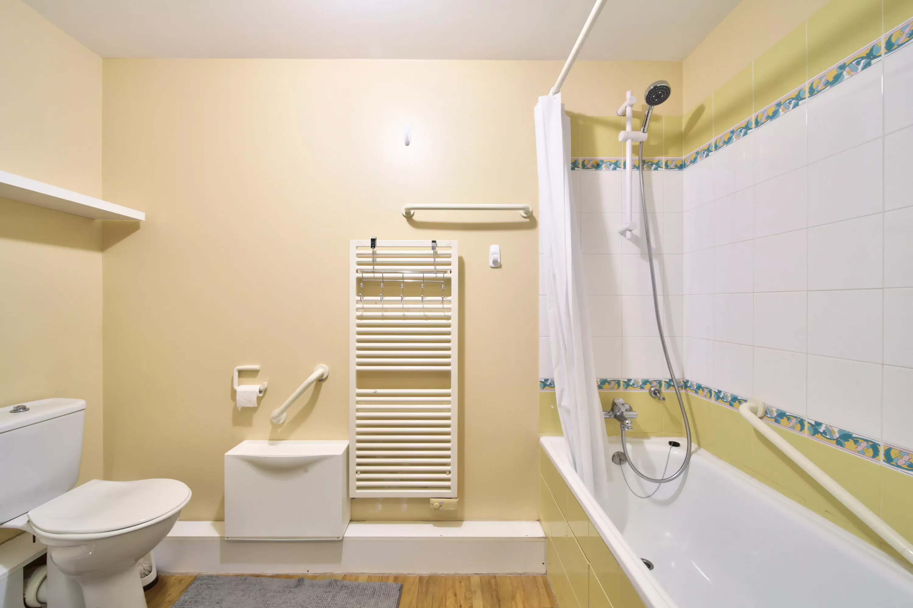 Il bénéficie d’équipements d’aide à la mobilité, tels qu’une circulation intérieure adaptée, une salle de bain spacieuse avec WC rehaussé et barre d’appui, un évier abaissé, ainsi qu’une baignoire équipée d’une barre d’appui.