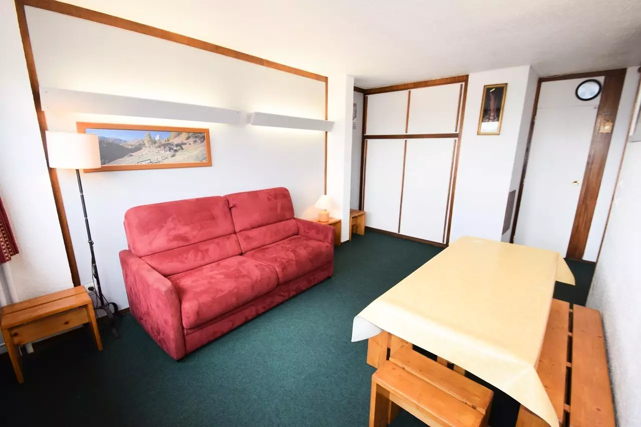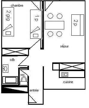 Séjour : 1 canapé-lit 2 pers., T.V. - Chambre : 1 lit rabattable 2 pers + 1 lit 1 pers. - Salle de bains : baignoire - WC séparés. Literie : 2 couettes 2p et 1 couette 1p- Sols : séjour : moquette, autres pièces : plastique. Appartement non fumeur, animaux non admis. En option et en supplément: Ménage de fin de séjour, draps, serviettes, forfaits ski.