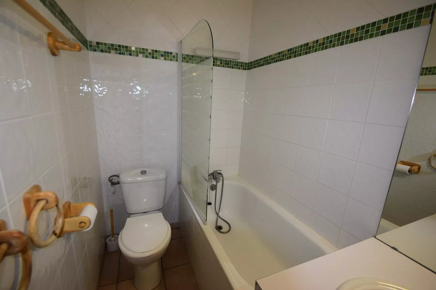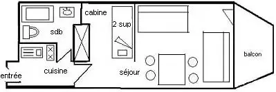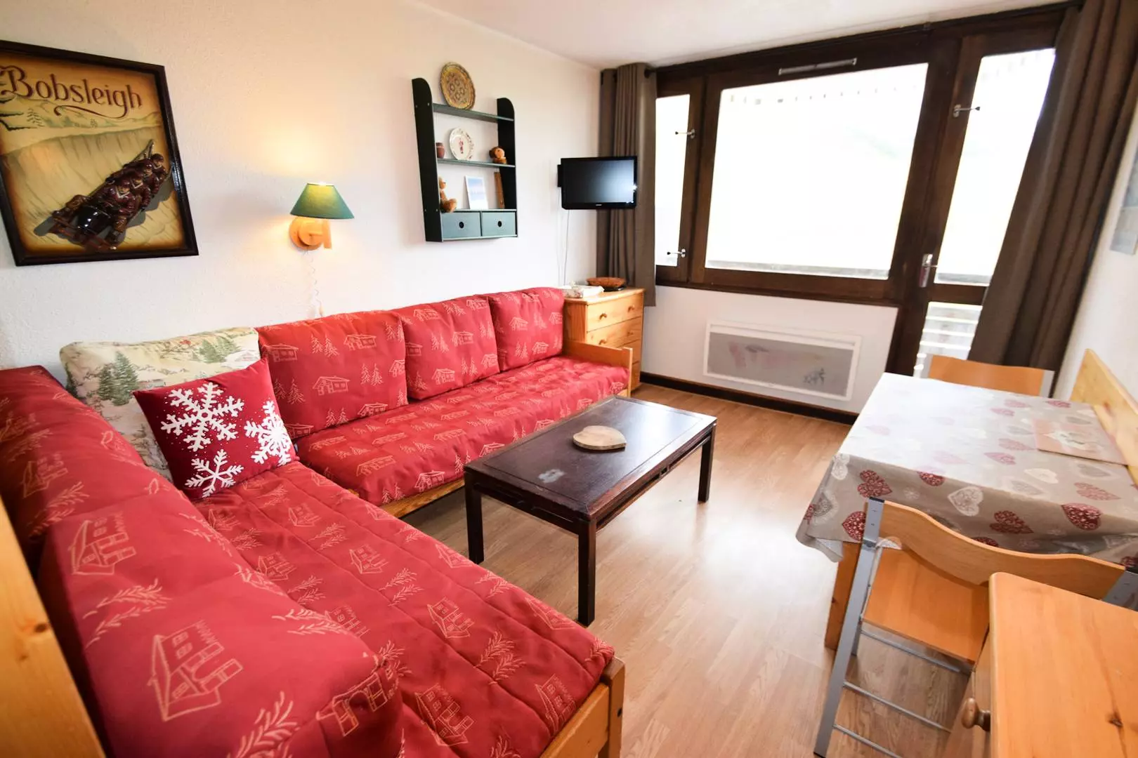 Studio 26m2, 3/4 pers, expo sud, balcon, vue pistes, étage H avec ascenseur diamant. Cuisine dans l'entrée/couloir : 2 plaques vitro-céramiques, réfrig, four traditionnel, lave-vaisselle. Séjour : coin repas, 2 lits banquette 1 pers, télévision. Coin cabine : 2 lits superposés. Salle de bains : baignoire, WC inclus. Studio agréable bien exposé, ensoleillé. Literie: couettes. Casier à skis n° H49 sous ESF niveau F salle n°1.