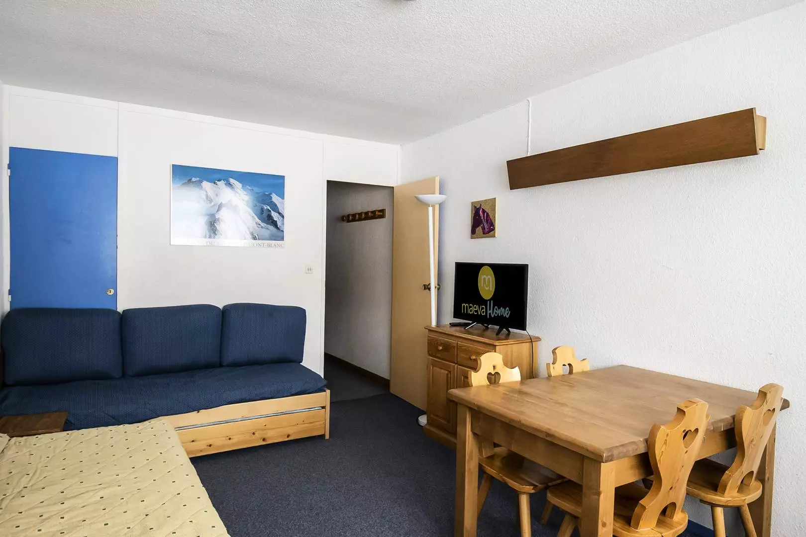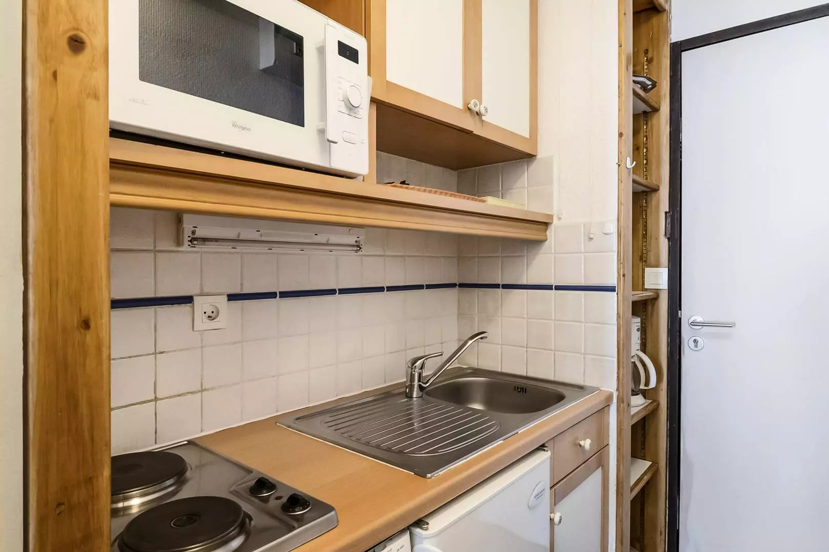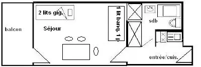 Studio 3 pers, 22M2, avec balcon, exposition Sud, vue sur les piste, 7eme étage, avec ascenseur Cuisine : dans l'entrée : 2 plaques élect, four micro-ondes/grill, refrigérateur, lave-vaisselle, cafetière électrique - Séjour : 1 banquette lit 1 pers, 2 lits gigognes, TV - Salle de bains : baignoire, WC inclus - Literie : 3 couettes 1 pers.
