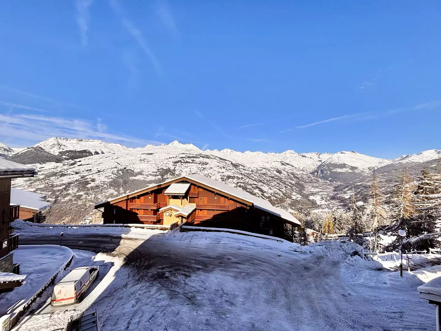 Le balcon avec vue plongeante sur la vallée est exposé Nord. Le casier à skis est dans la résidence.
