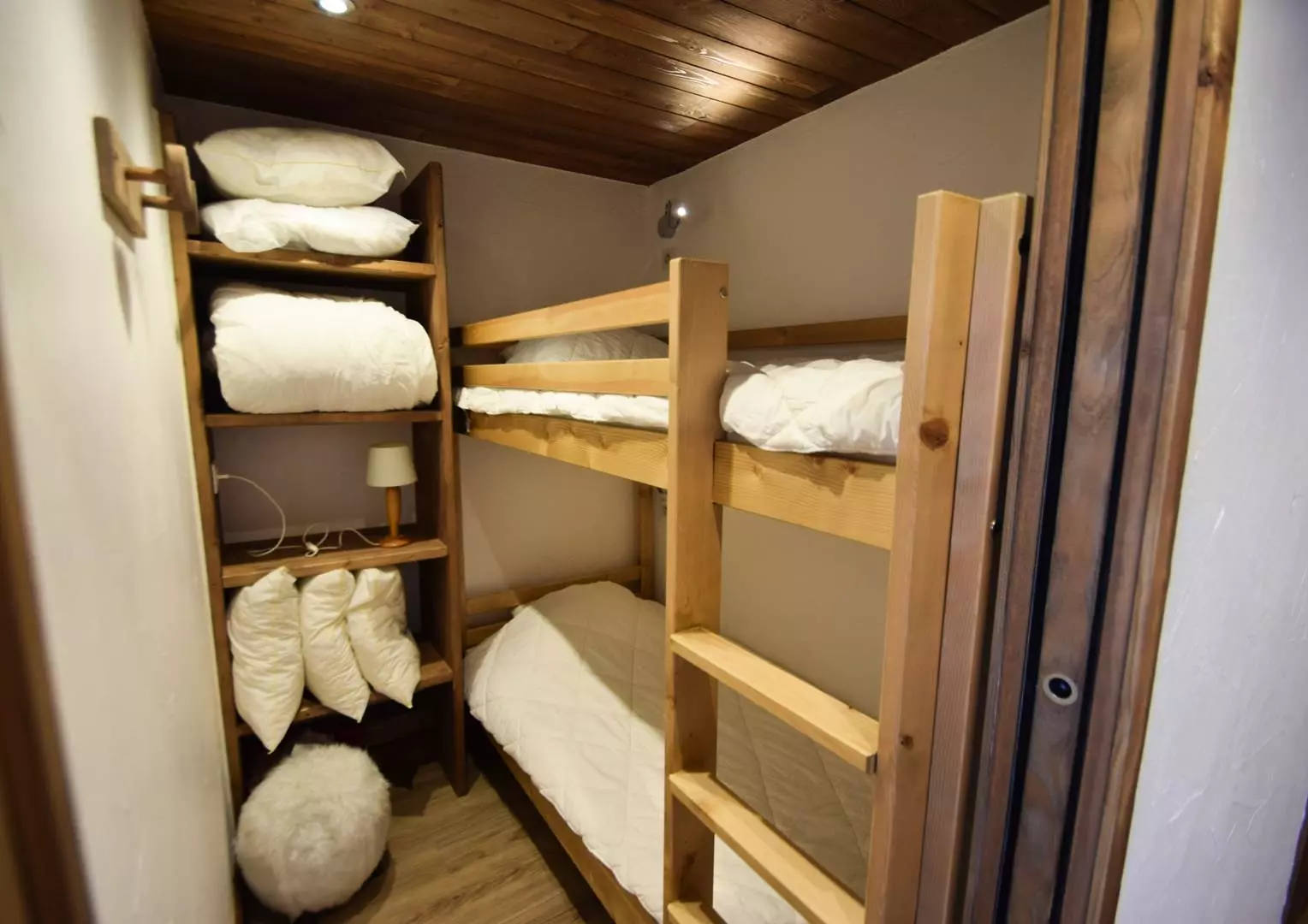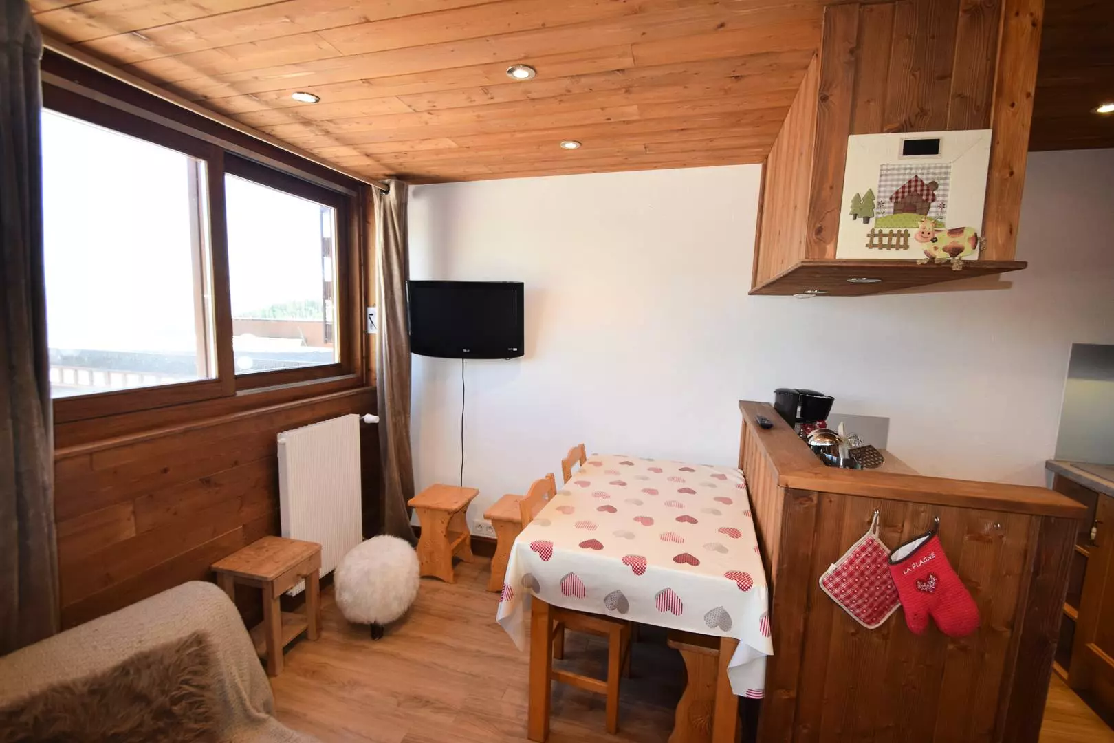 Studio cabine 4/5 personnes, 27m2, 2ème étage par escaliers depuis le parking, 1er étage depuis la piste, exposition Nord vue sur le Mont-Blanc, sans balcon.