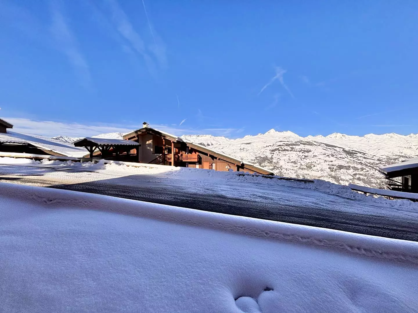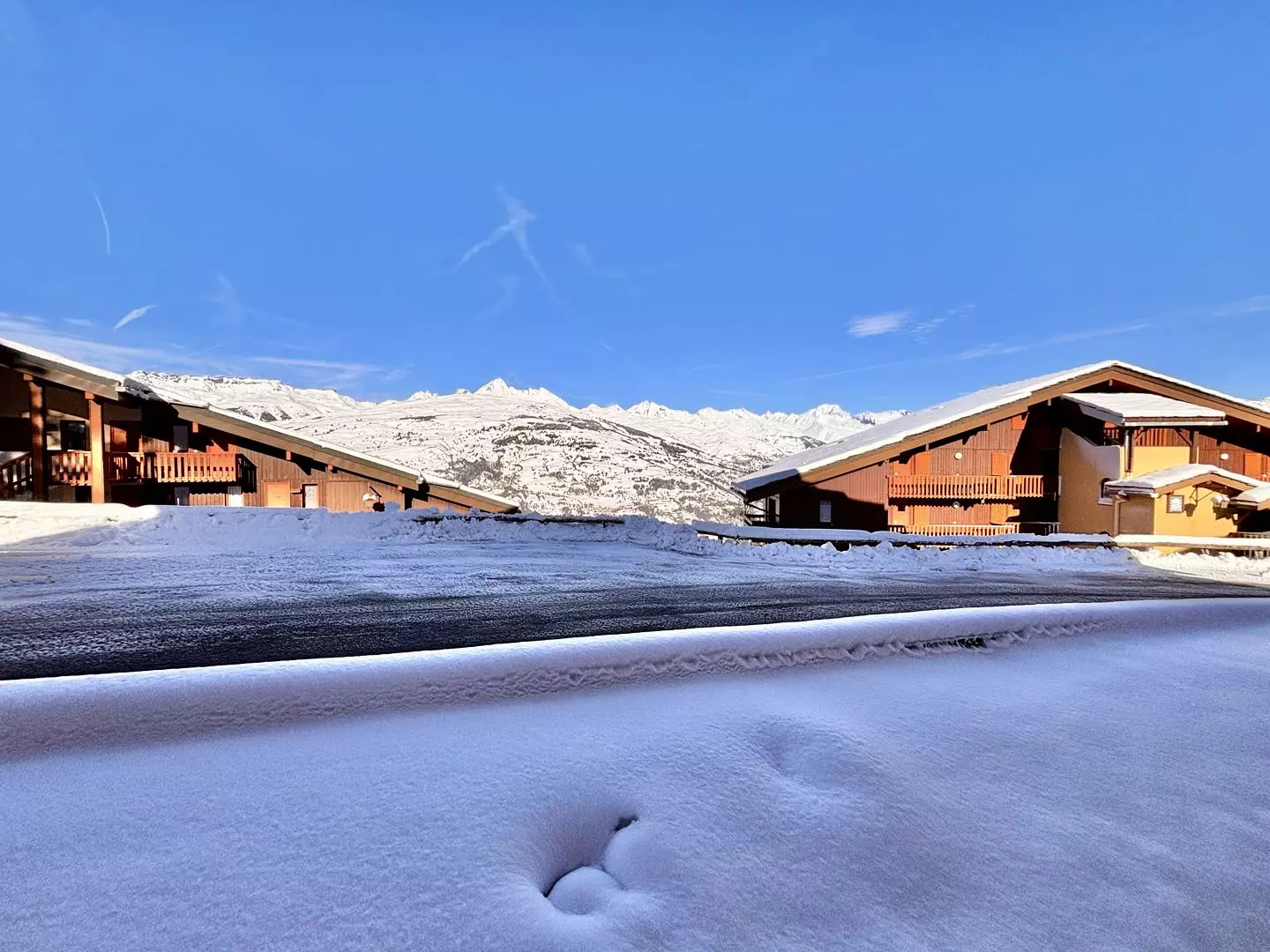 Le balcon avec vue sur le Mont Blanc est exposé Nord. Le casier à skis est dans la résidence.