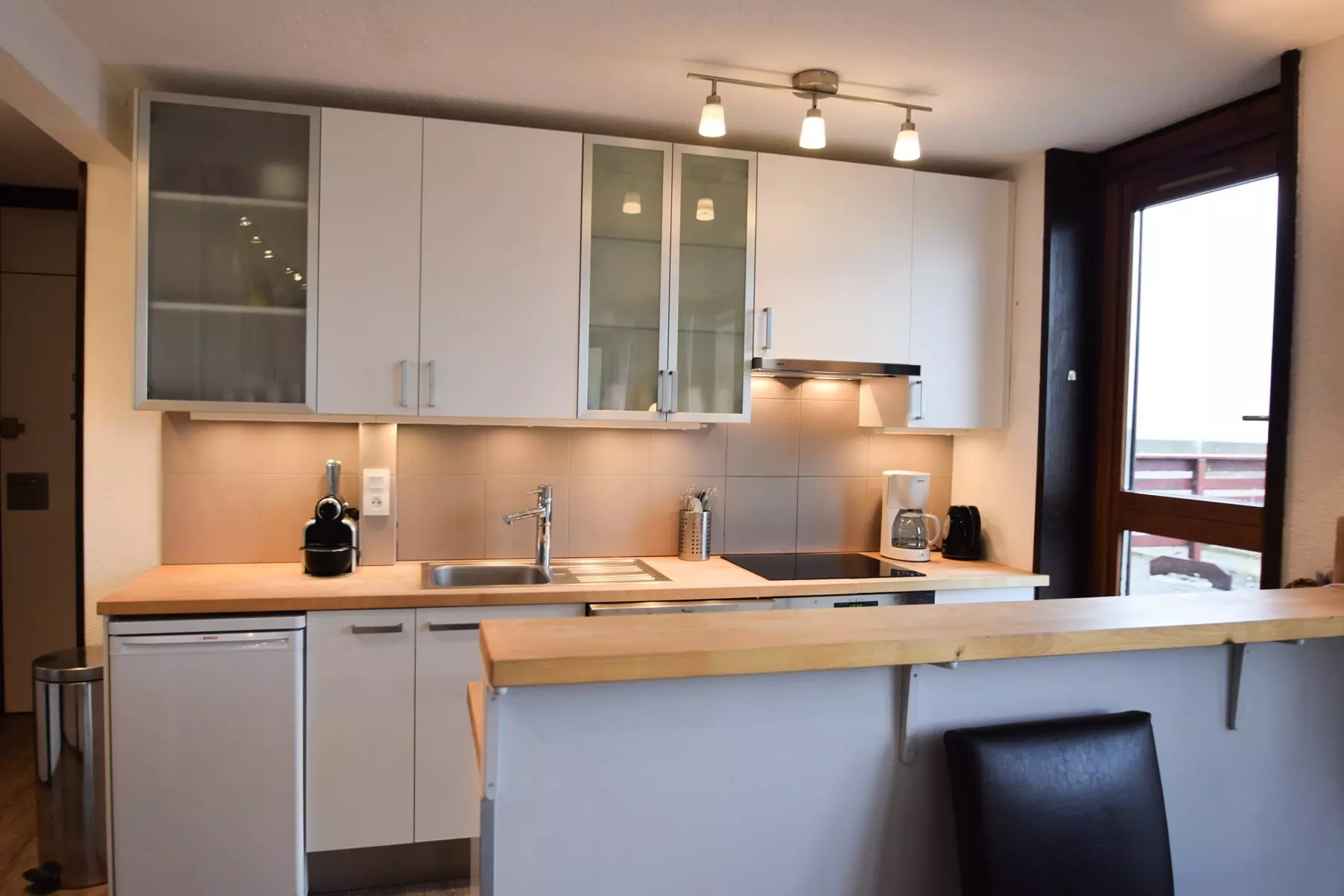 Appt 3 pièces 6 pers, 57m2, terrasse, expo Sud et Ouest, grande terrasse (déneigement non garanti), vue Pistes étage N, avec ascenseur (Partie Chamois). Cuisine dans séjour : 4 plaques à induction, réfrigérateur petit modèle, four, four micro-ondes, lave vaisselle, cafetière élect. Séjour : coin repas, salon, télévision . Chambre 1 : 1 lit 2 pers 160x190cm, accès terrasse. Chambre 2 : 2 x 2 lits superposés Salle de bains : baignoire + WC - 1 autre WC séparé. Literie : 5 couettes 1p et 1 couette 2p. Appartement non fumeur, animaux non admis. En option et en supplément: Ménage de fin de séjour, draps, serviettes, forfaits ski.