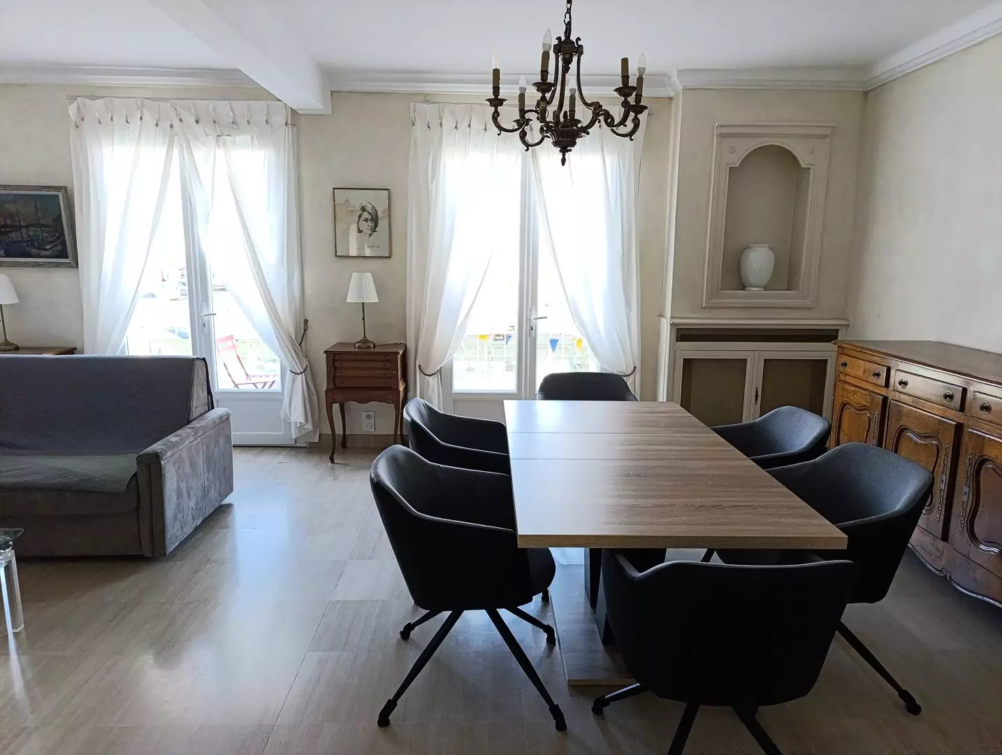 RIVE GAUCHE - Dans une maison de Maître au Centre Ville sur le Quai et face au Canal. Au 1er étage, P3 de 93m² rénové et climatisé, constitué d'un très grand salon de 40m² lumineux avec un canapé convertible en 140 cm, climatisation et une télévision, donnant sur un balcon filant avec belle vue sur le canal. Une cuisine séparée entièrement équipée (Micro-ondes, four, plaque de cuisson, lave-vaisselle, frigo/congélateur, lave-linge). Deux chambres climatisées avec lit en 180 cm et télévision. Une salle d'eau avec une douche. Un wc séparé. Meublé et équipé pour 6 personnes. Véhicule non nécessaire, possibilité de garage en supplément à 200m au prix de 60€ à 100€/Semaine selon saison. (Possibilité de louer l'ensemble de la maison 2 x P3 pour un total de 12 couchages). Les animaux ne sont pas admis.