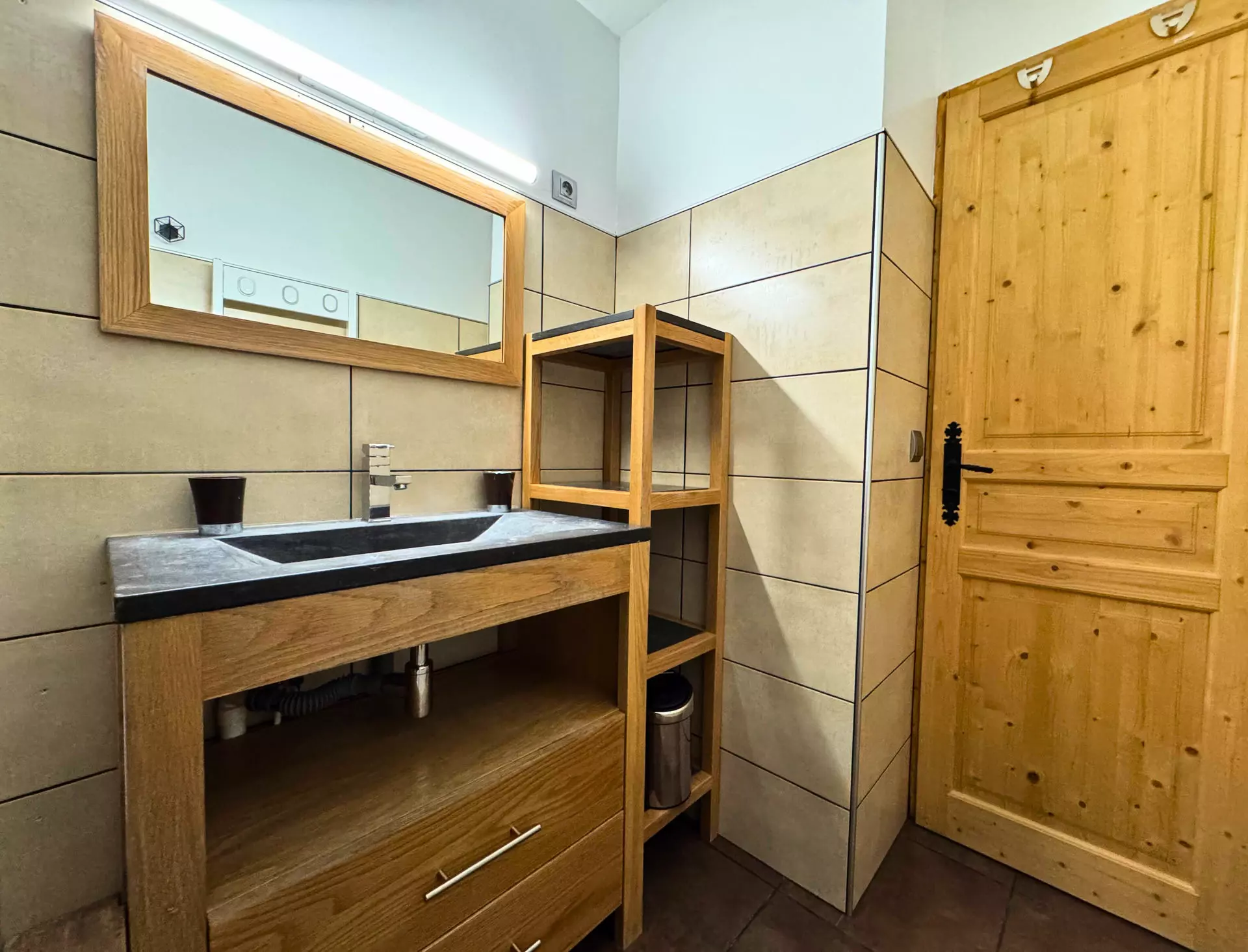 Salle de bain : lavabo, douche, sèche-serviettes, sèche-cheveux