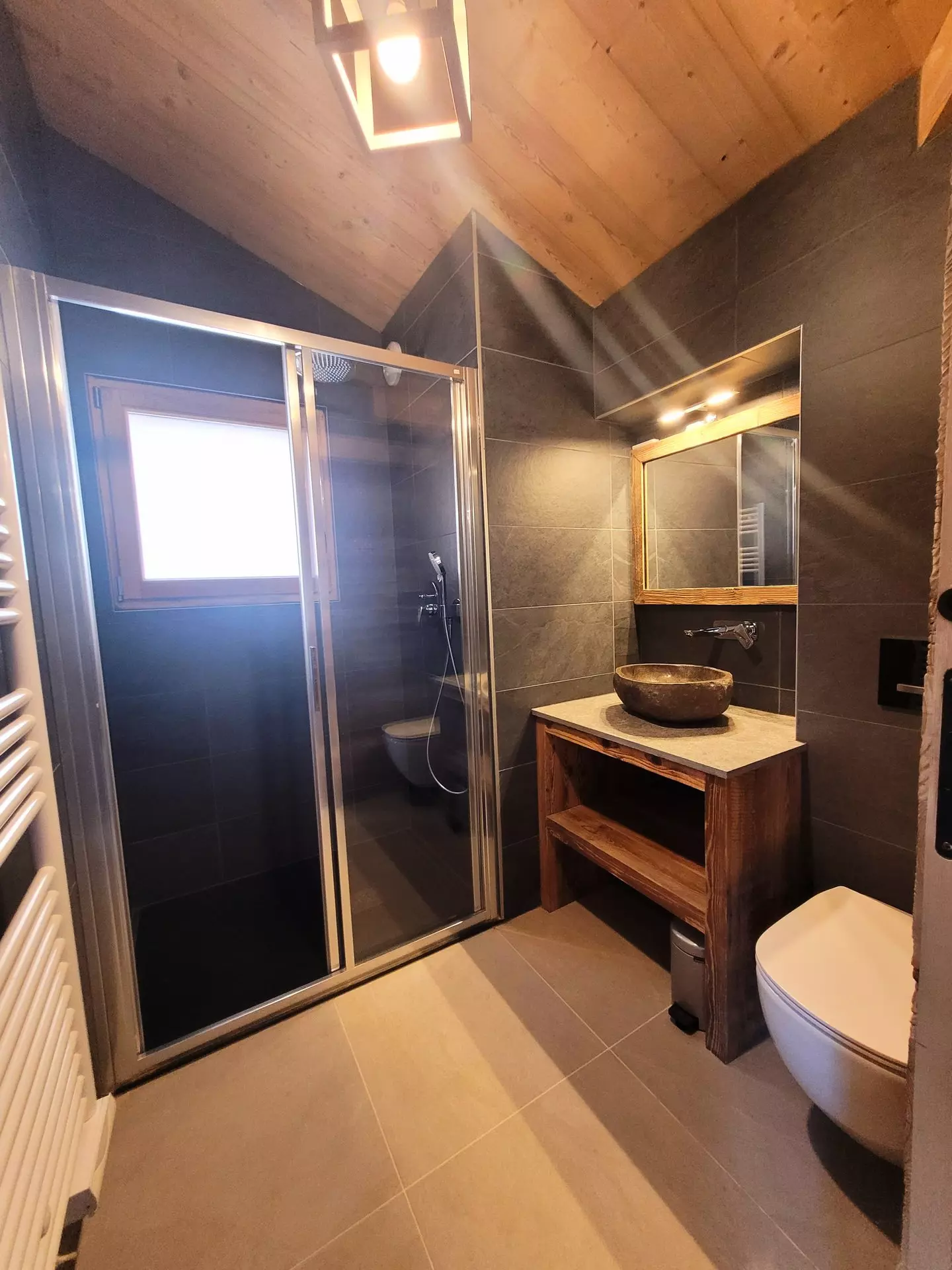 - Une salle d'eau avec vasque, douche, sèche serviettes et wc.