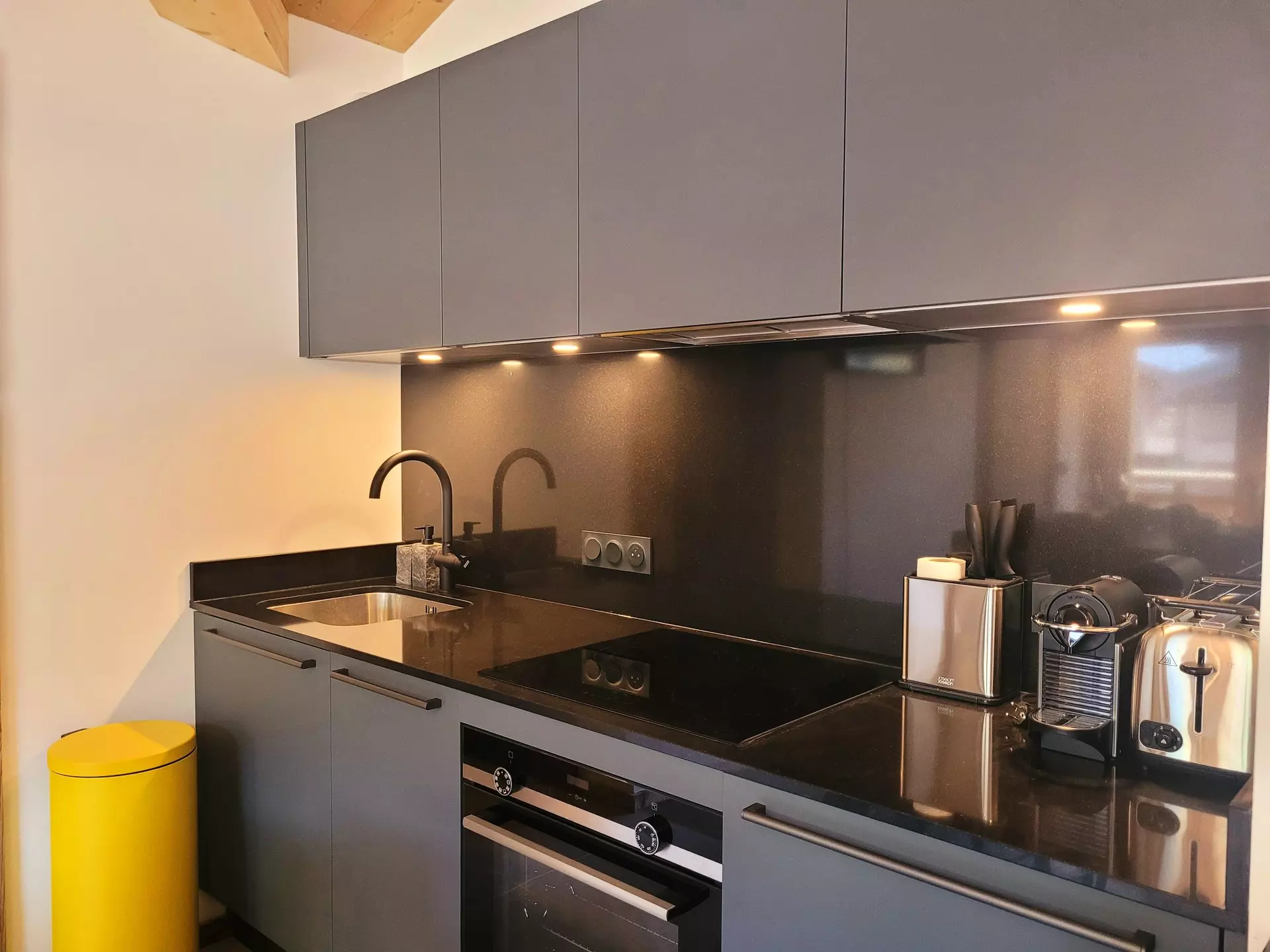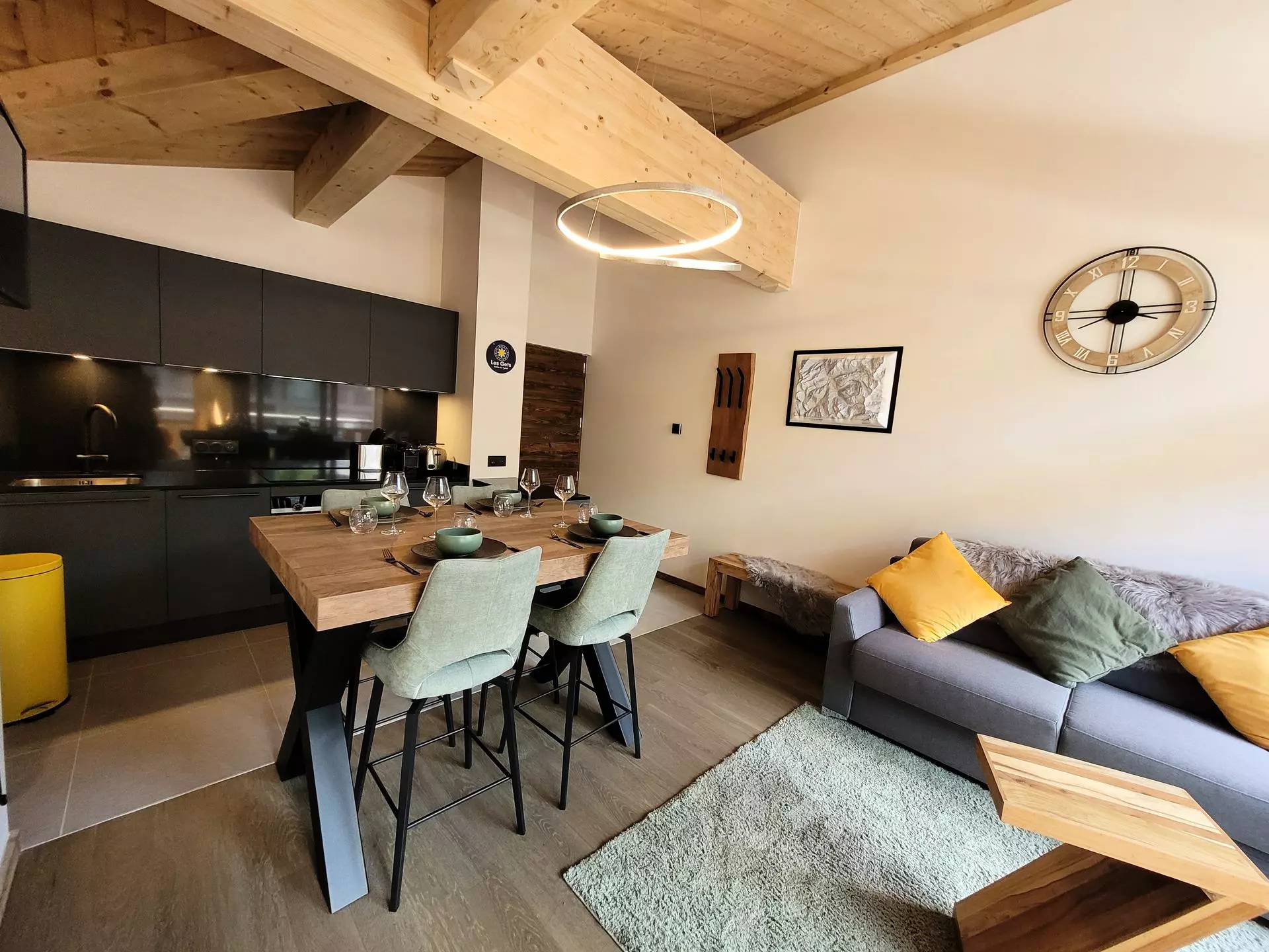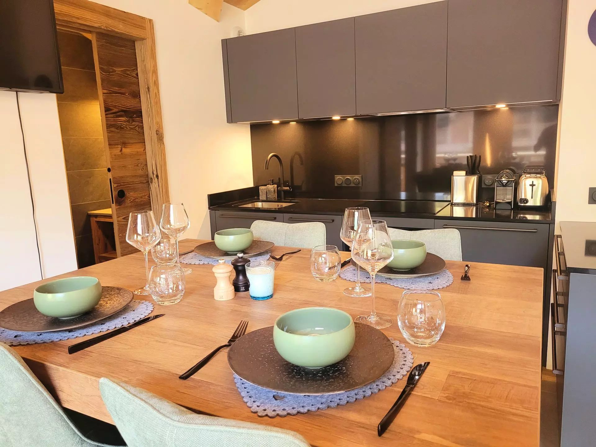 Cuisine entièrement équipée avec micro-ondes/four intégré, plaques à induction, hotte, lave-vaisselle, réfrigérateur, grille-pain, cafetières Nespresso, appareil à raclette et fondue, Wifi, étandage à linge.