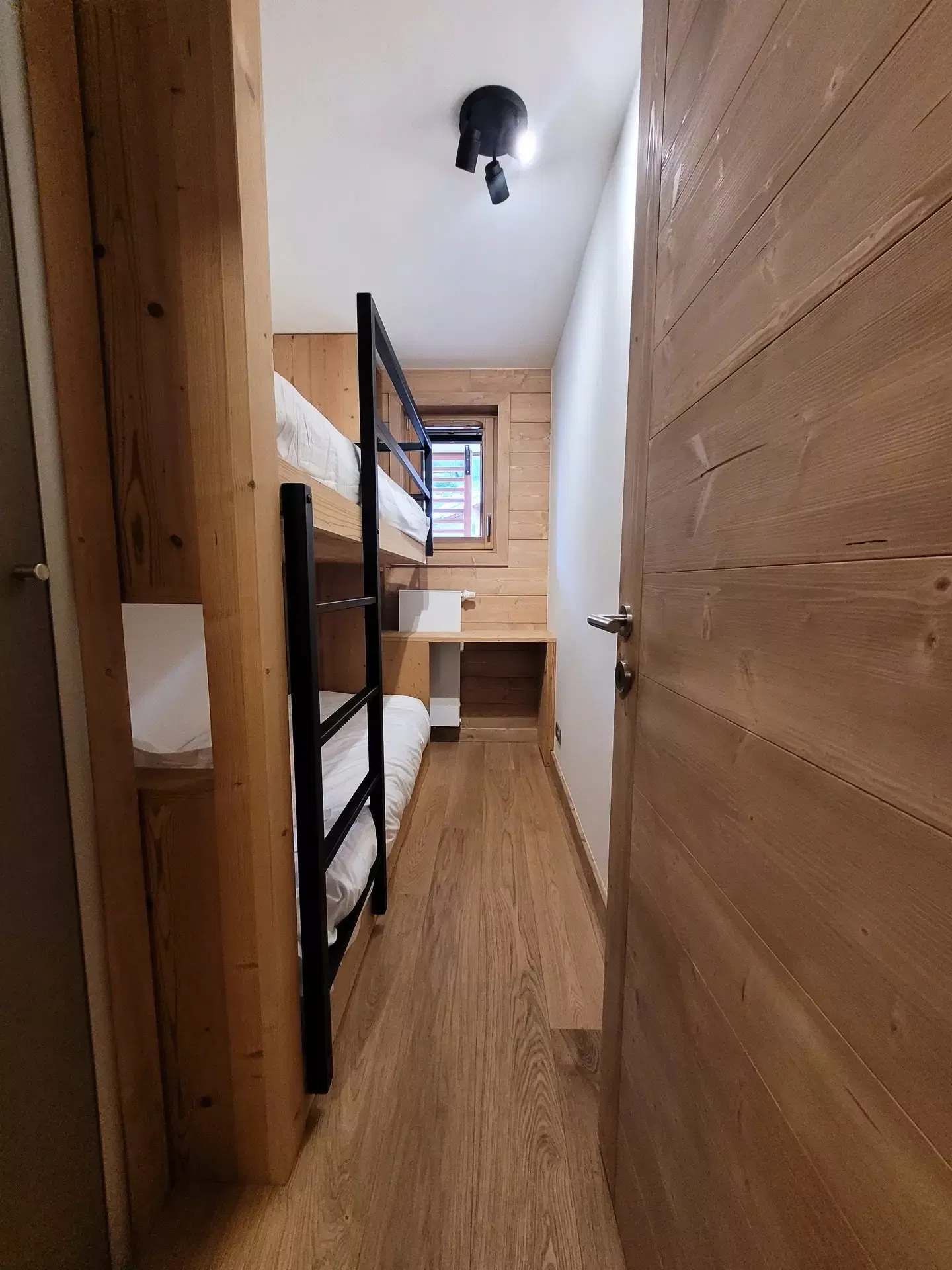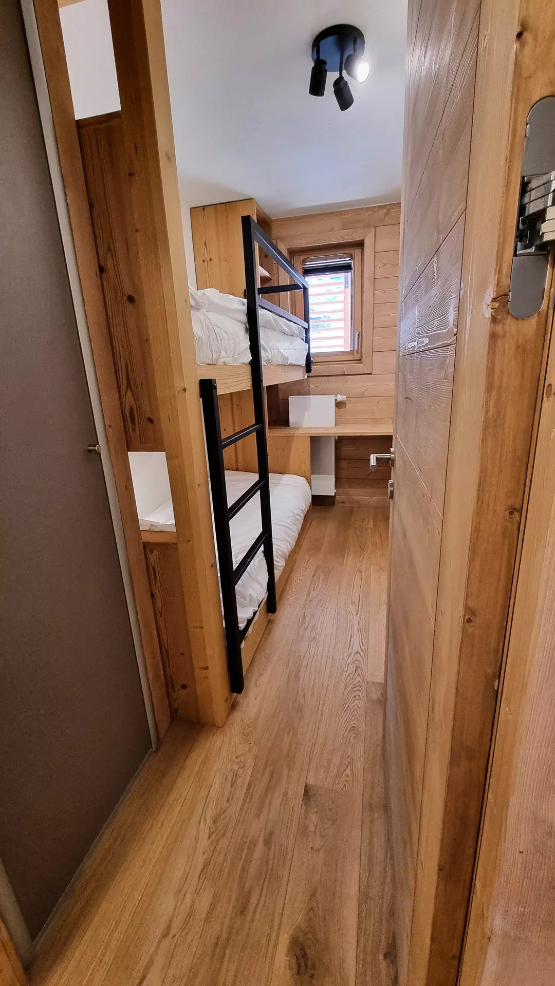 - Un coin montagne équipé de 2 lits superposés de 80cm x 190cm, rangements et petit bureau