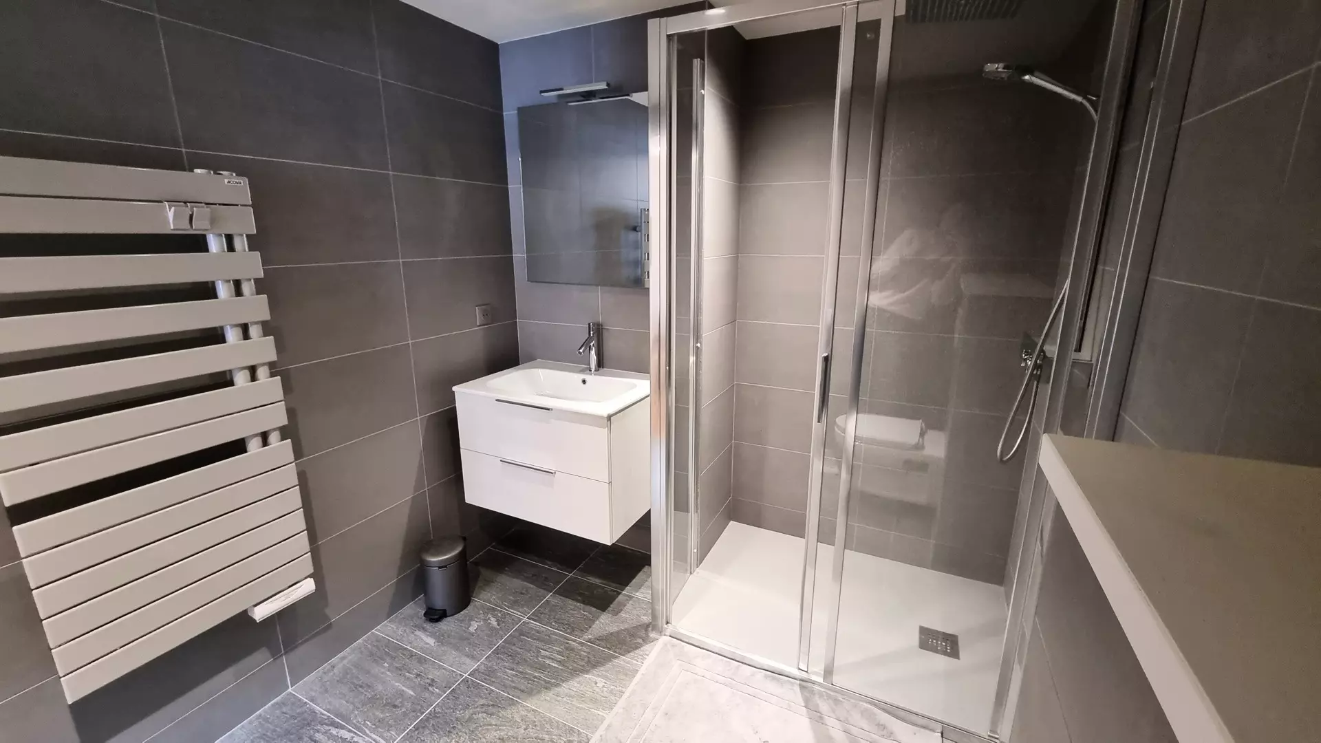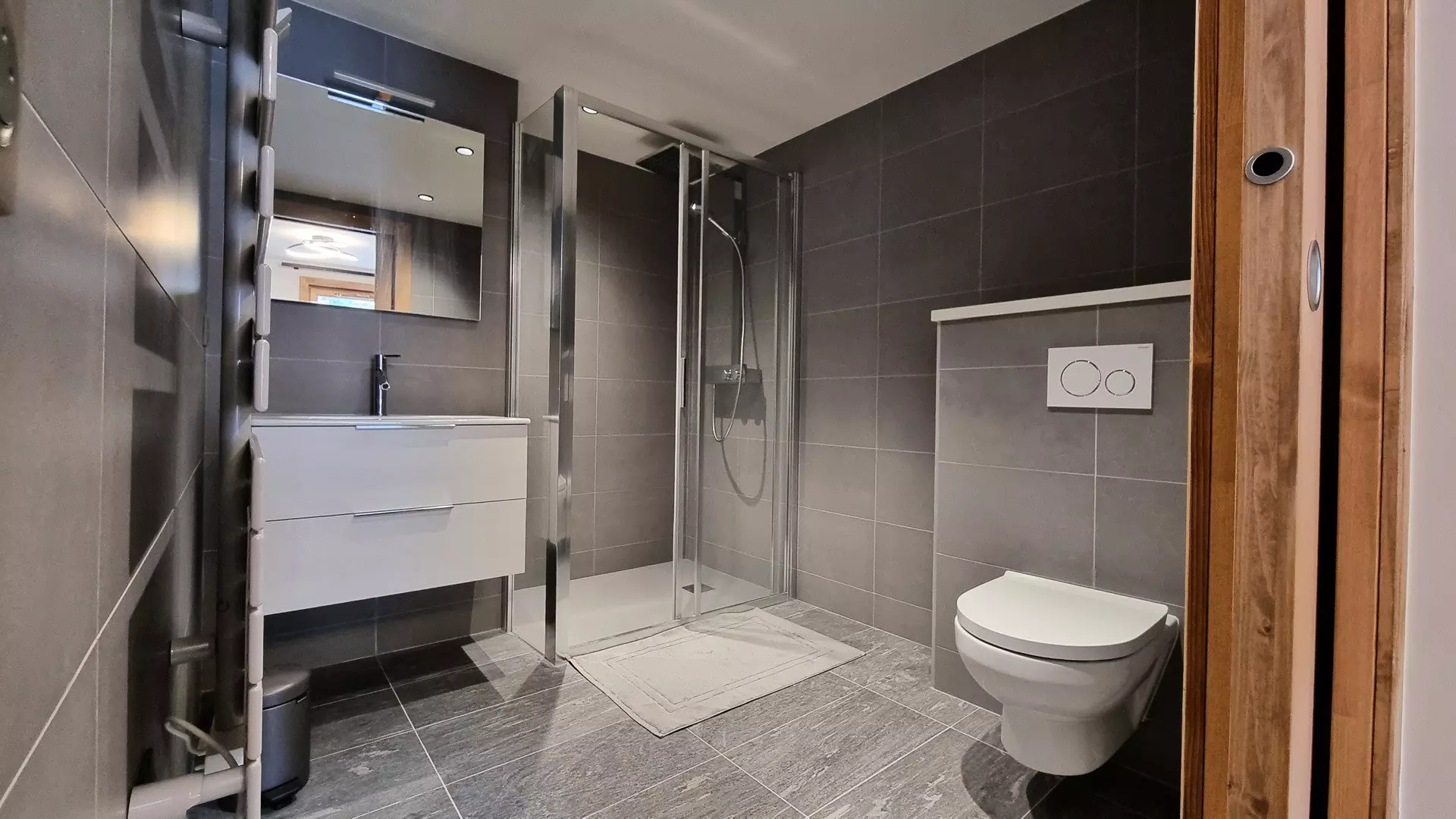 - Une chambre double parentale équipée d'un lit 160cm x 200cm en suite, comprenant une cabine de douche, lavabo, WC et sèches serviettes. Rangements et TV