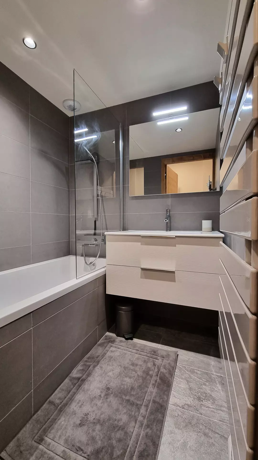 - Une salle de bains indépendante avec baignoire et douchette, lavabo, sèche serviettes