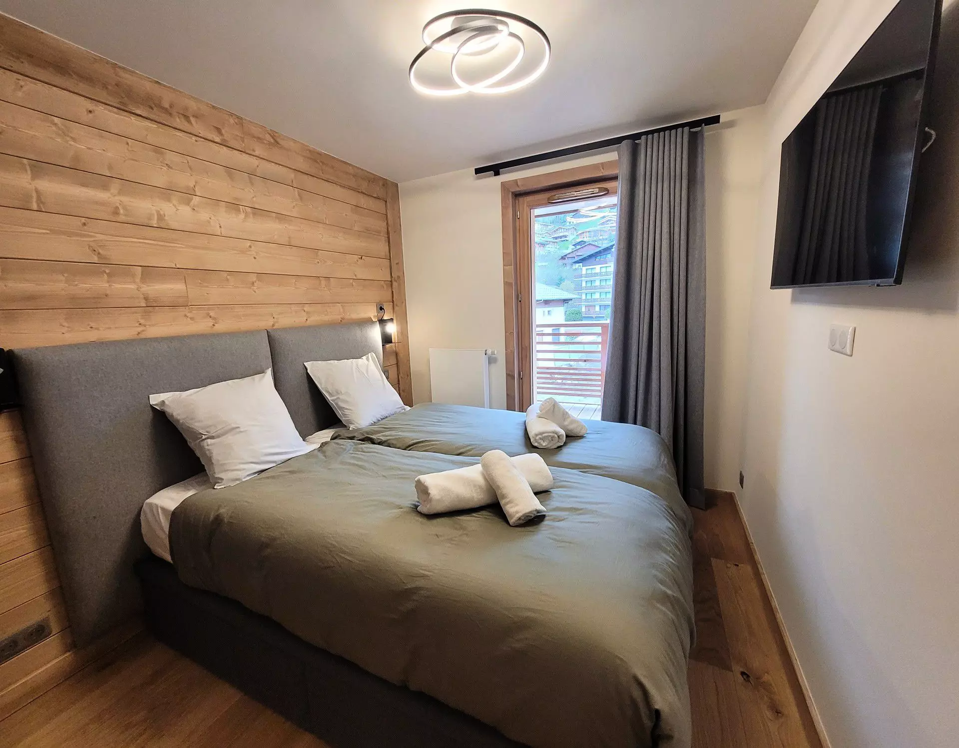 - Une chambre double équipée de 2 lits simples (80cm x 200cm) pouvant être rapprochés pour constituer un lit double de 160cm x 200cm, rangements et TV, acces balcon.
