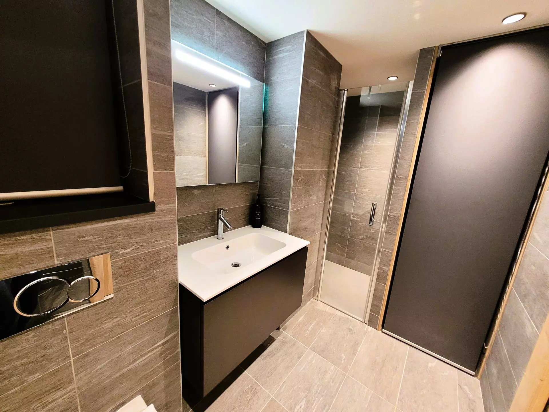 - une salle de bain avec douche , wc, vasque, sèche-serviette, lave linge et sèche linge