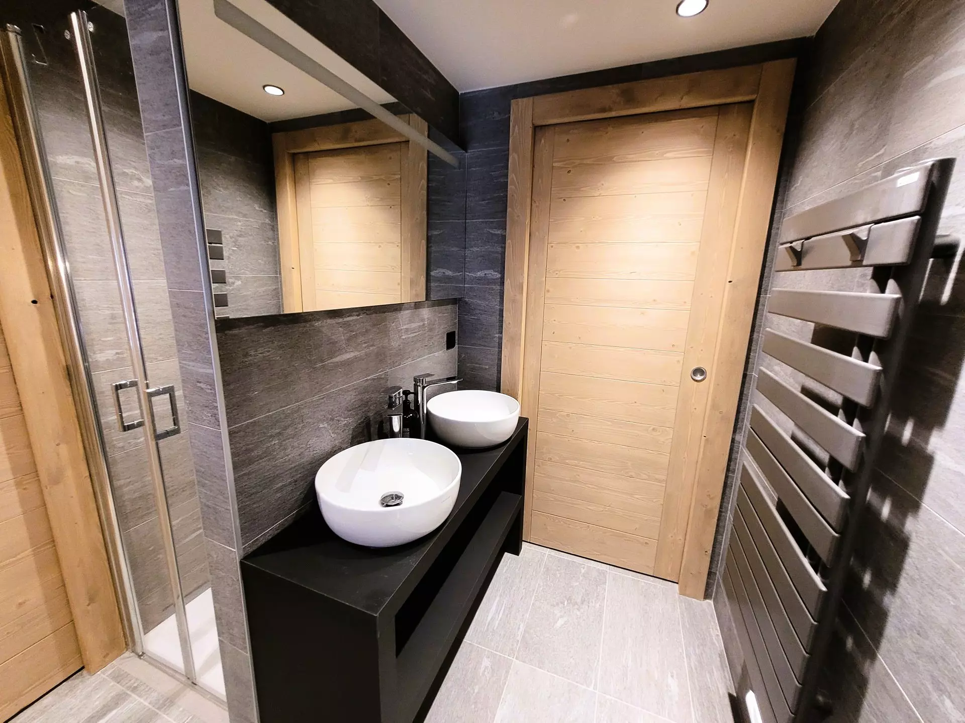 - une chambre en suite avec lit de 160cm, rangements, douche, double vasque, seche serviette et wc indépendants