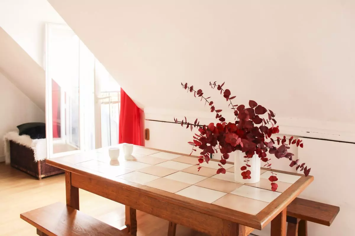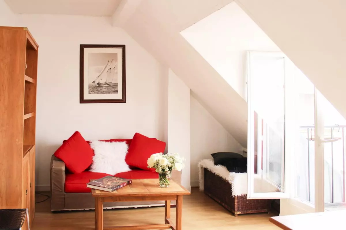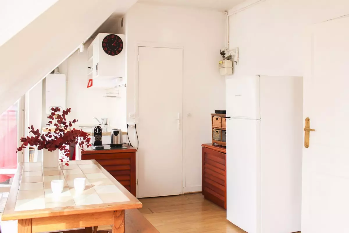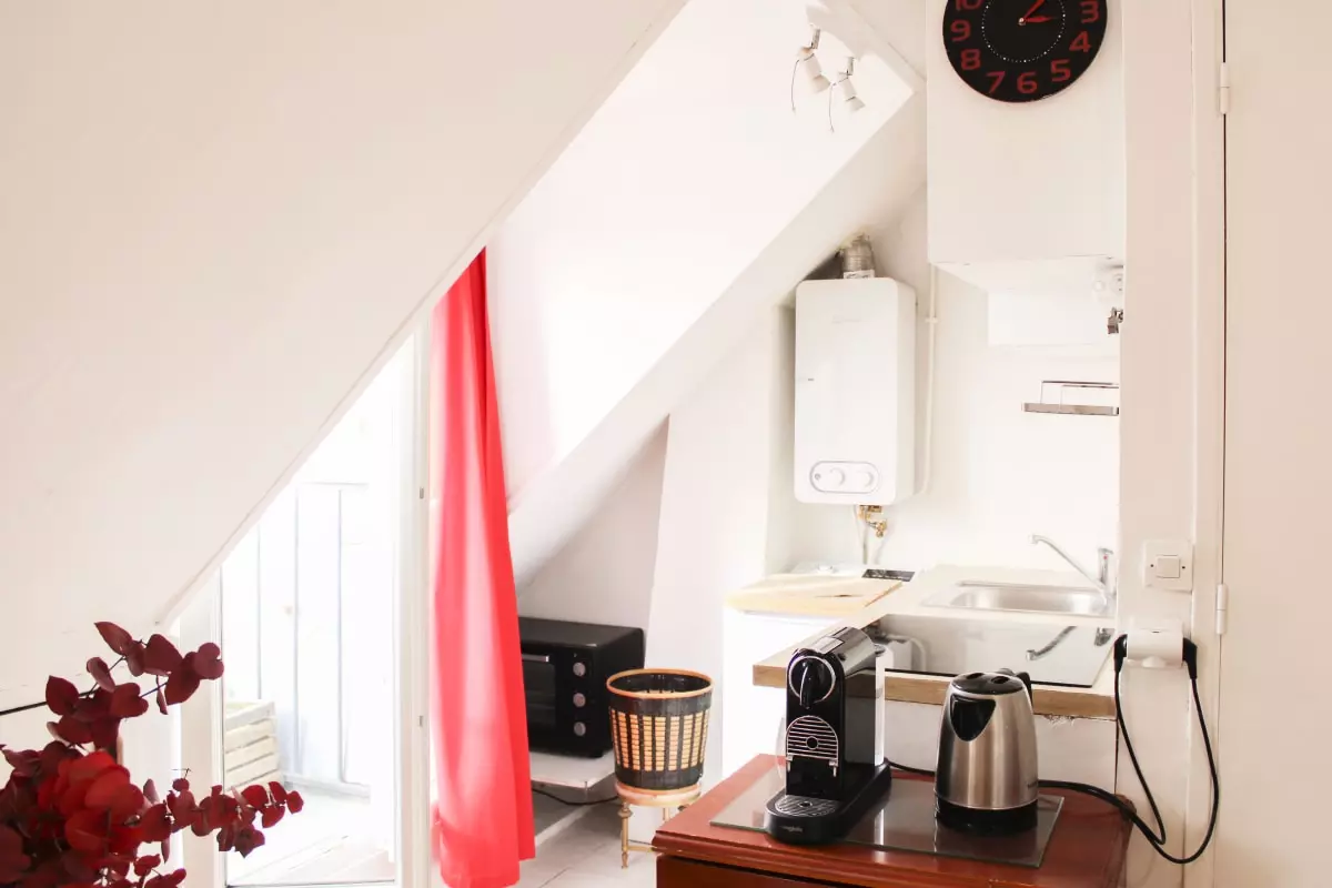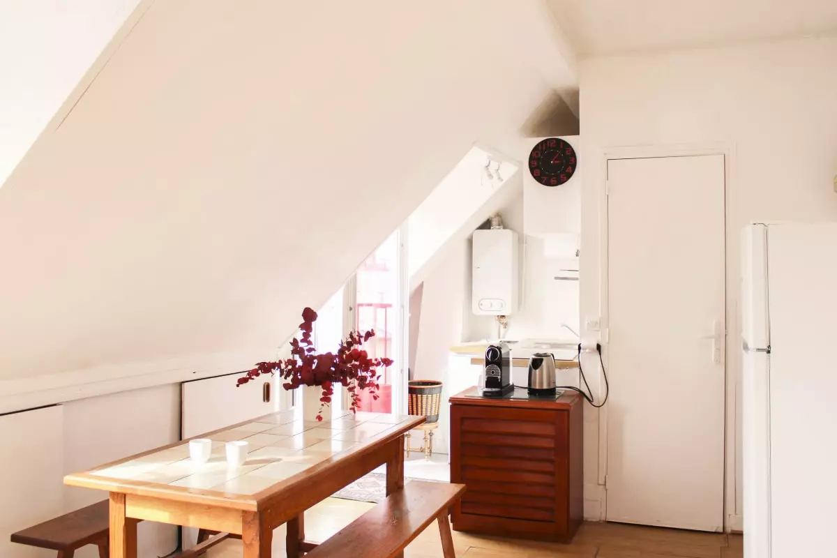 Cet appartement convivial et chaleureux sous les toits de Paris est localisé au 6ᵉ étage sans ascenseur, il comprend :