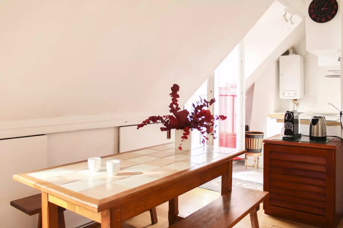- un balcon avec une table et deux tabourets, une belle vue sur les toits de Paris et Beaubourg et puis la tour Eiffel au loin ;