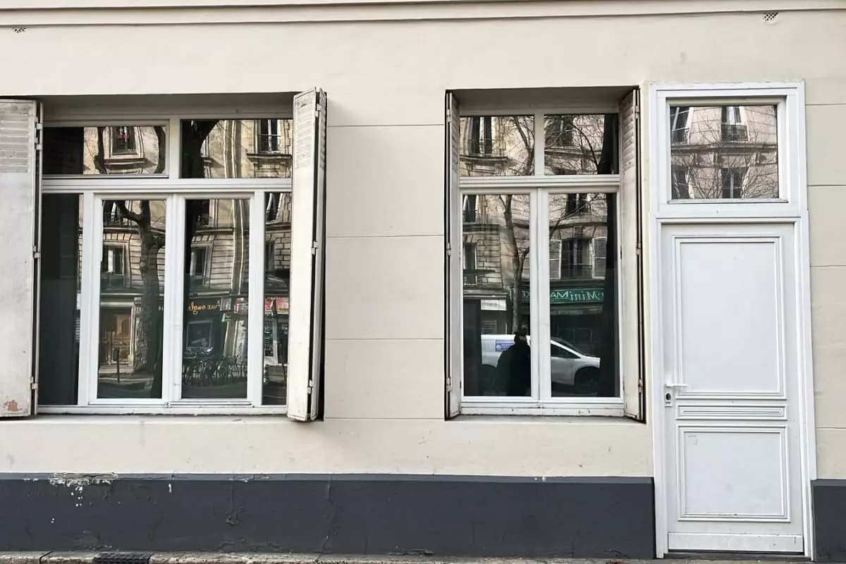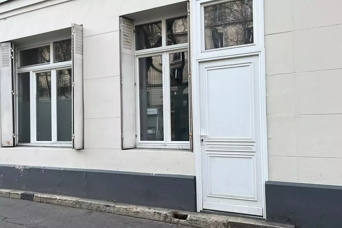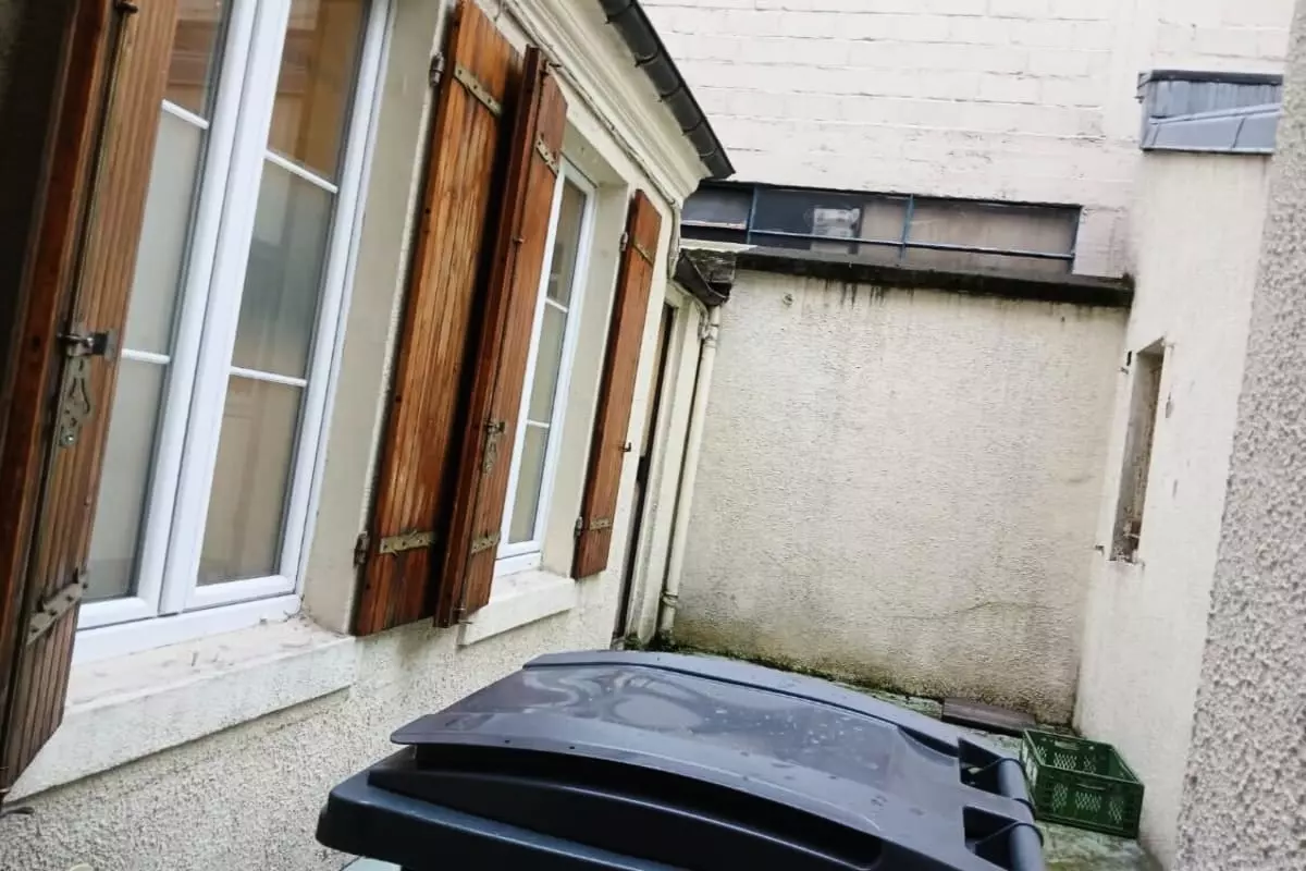 L'accès au logement se fait par une cour intérieure commune sur laquelle donnent les fenêtre du logement (zone de stockage des poubelles de l'immeuble). Notez que l'aspect visuel de cette cour gérée par la copropriété contraste avec le soin apporté à l'intérieur de l'appartement.