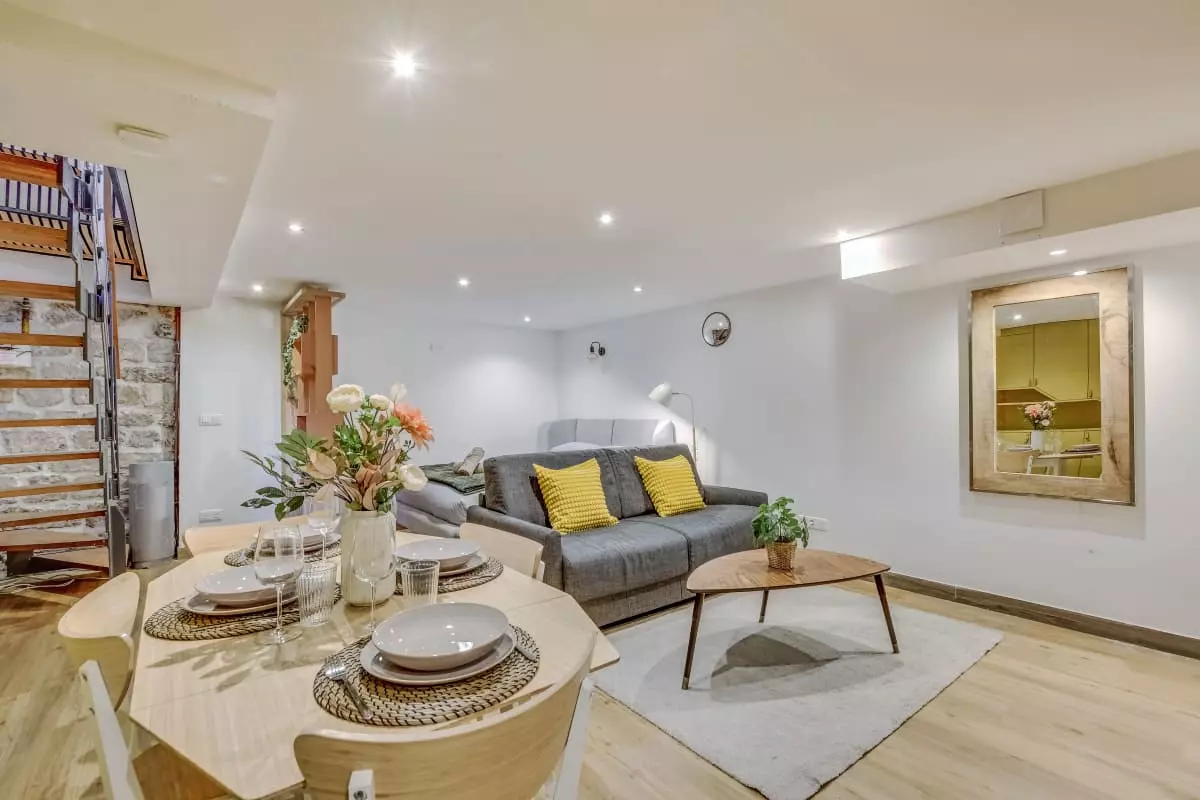 Le salon dispose d’un lit double de 160x200 ainsi que d’un canapé convertible de 140x200, offrant des couchages confortables et adaptés aussi bien aux couples qu’aux séjours en famille.