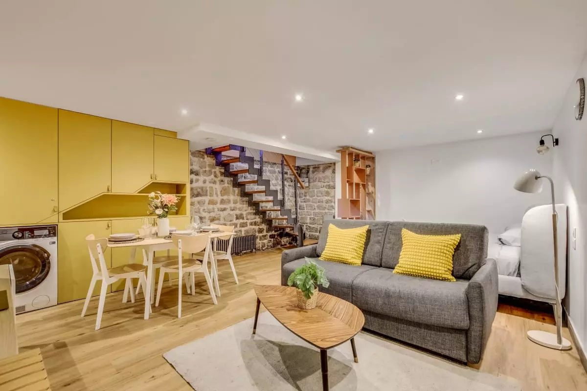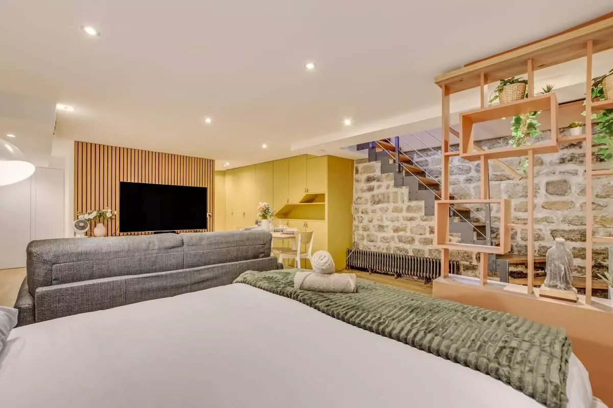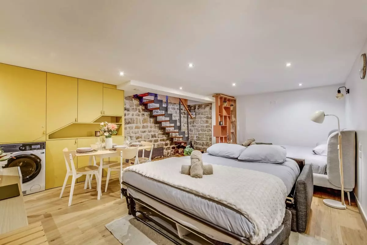 Installé au niveau inférieur d’un immeuble, il offre une atmosphère cosy et bien pensée, parfaite pour se reposer après une journée de découvertes parisiennes.