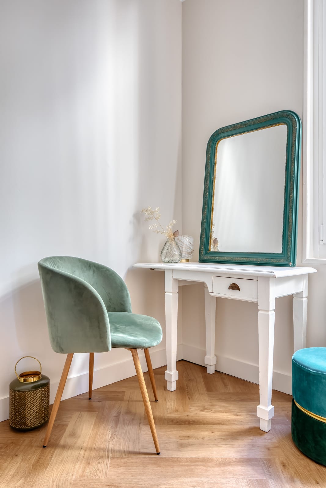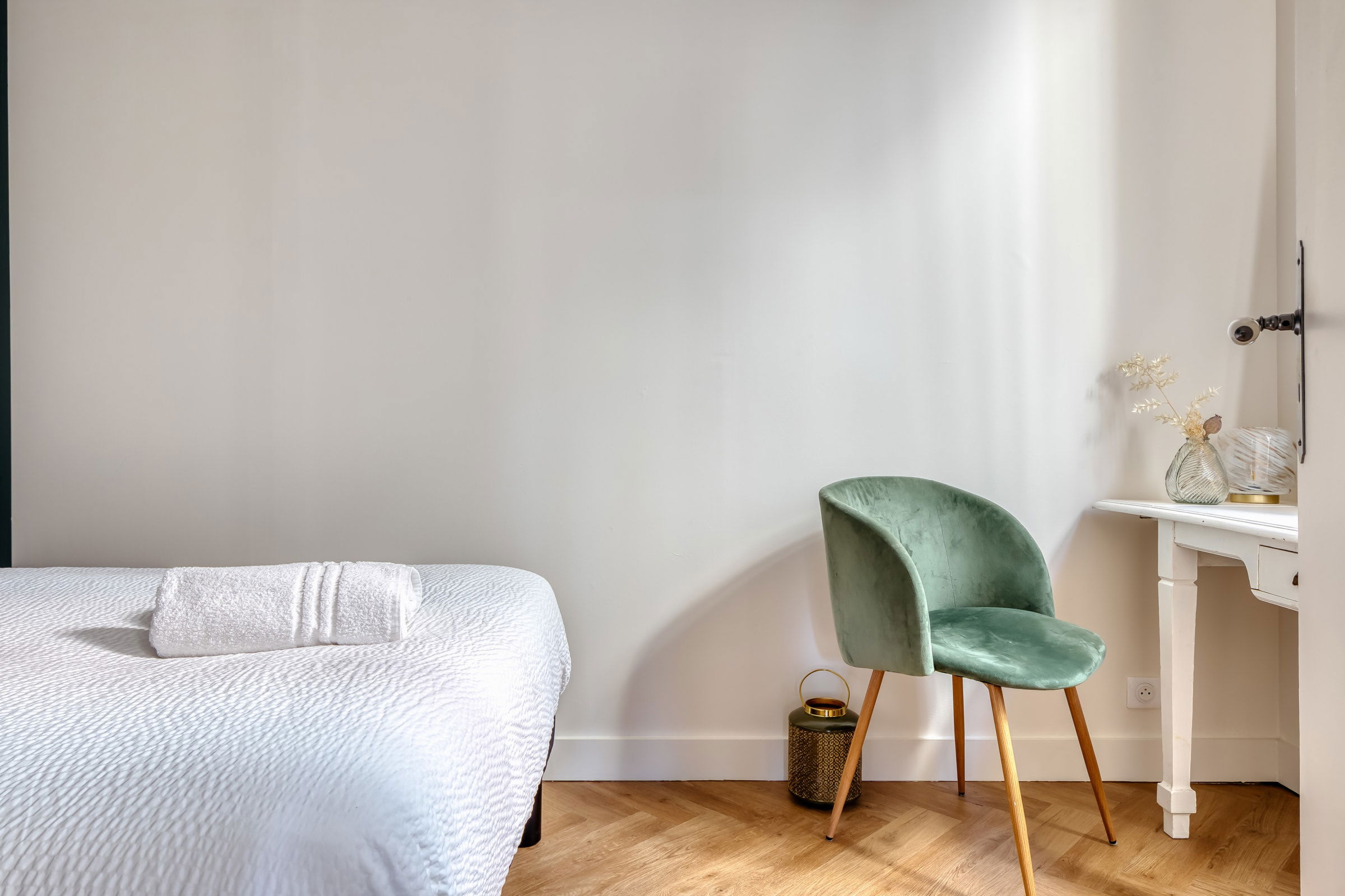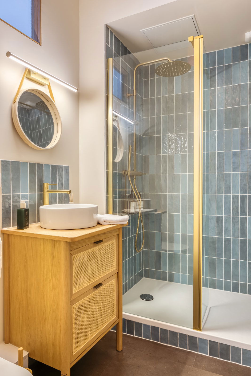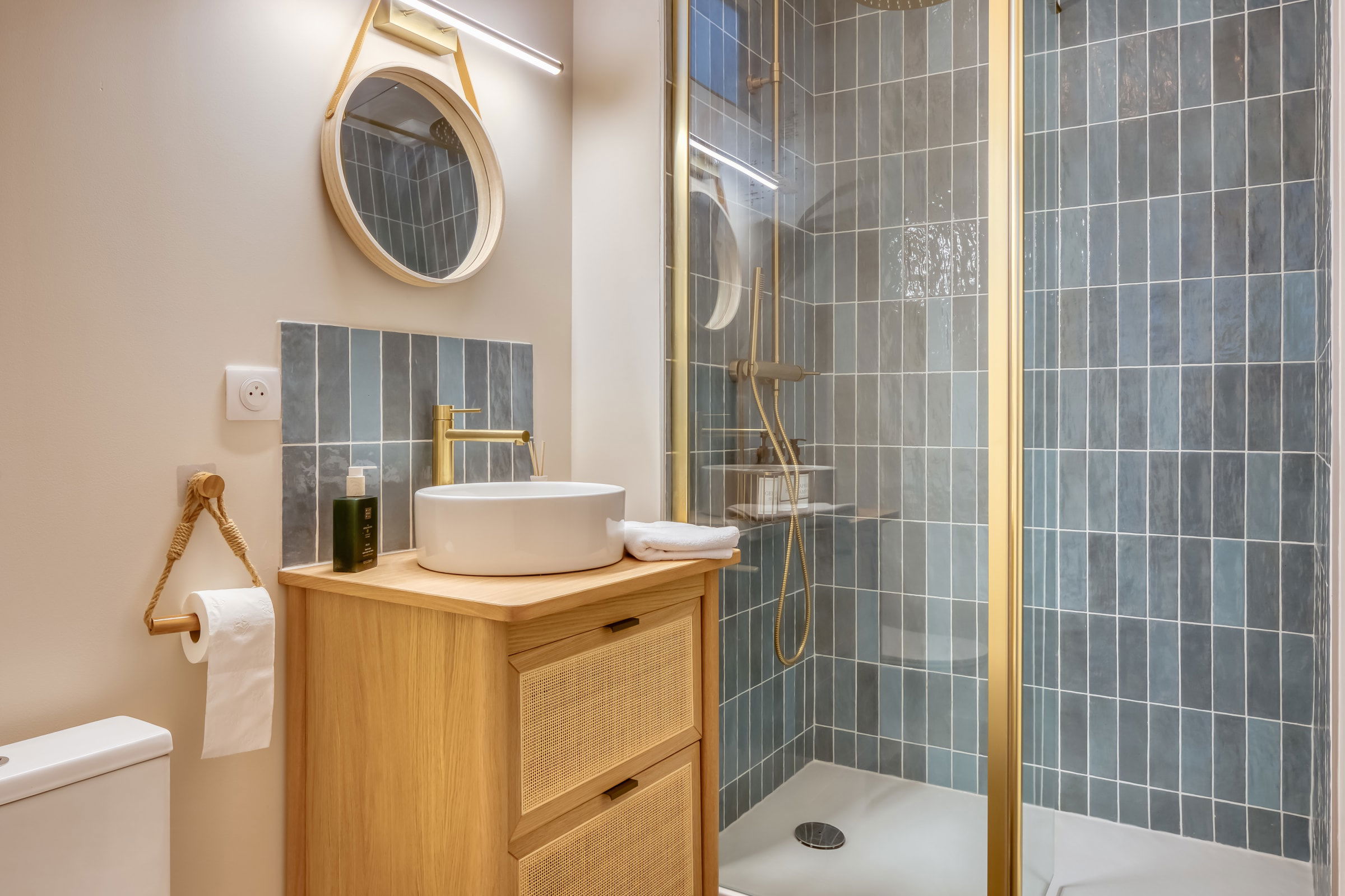 Côté nuit, la chambre vous offre une véritable parenthèse de calme. Donnant sur cour, elle promet des nuits paisibles, loin de l’agitation, dans un lit double confortable (140x200), idéal pour se ressourcer après une journée à explorer Rouen. La salle d’eau, moderne et élégante, dispose d’une douche, d’un meuble vasque, de WC et d’un sèche-cheveux. Un nécessaire de repassage est également à votre disposition.