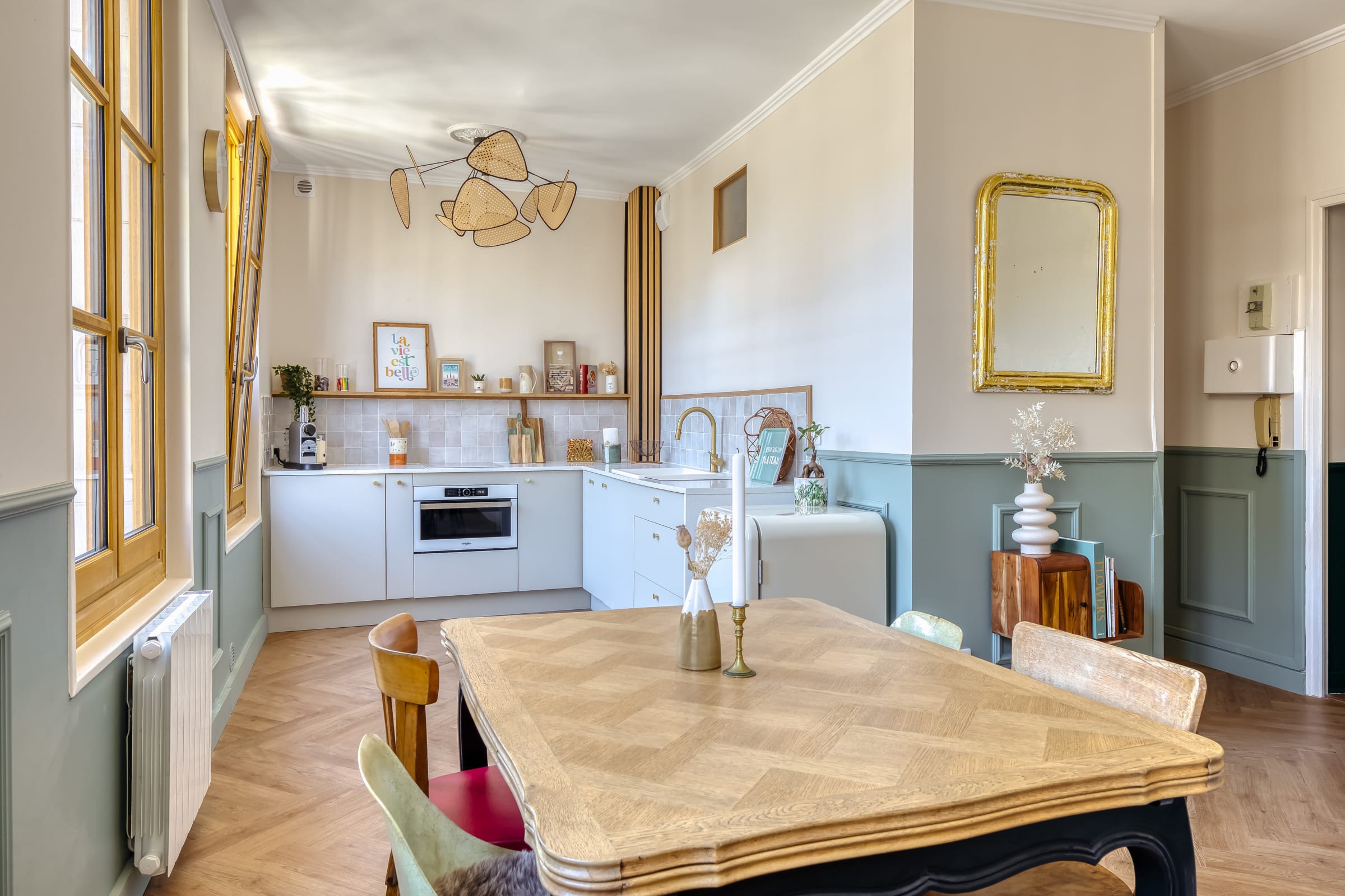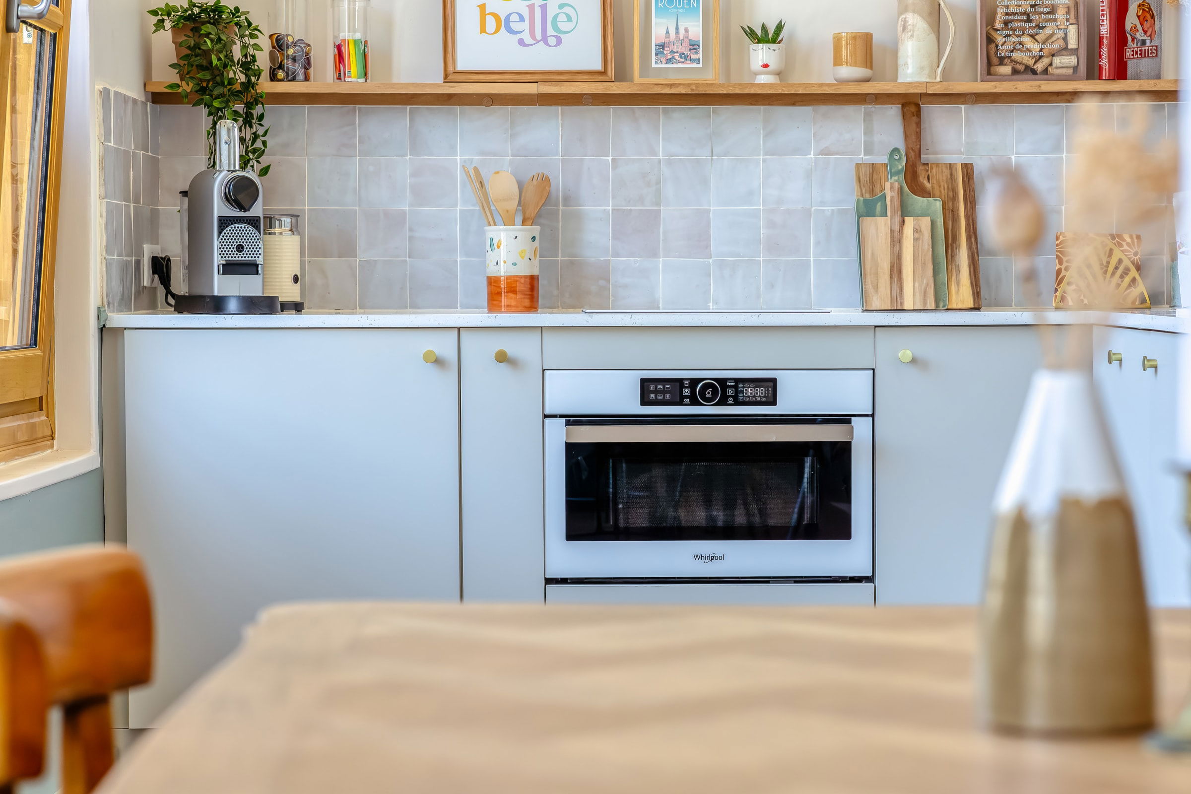 La cuisine, moderne et parfaitement équipée, vous permet de vivre à votre rythme, comme à la maison : plaques de cuisson, four, micro-ondes, lave-vaisselle, réfrigérateur, bouilloire, grille-pain, machine Nespresso et tous les ustensiles nécessaires sont à votre disposition. Que vous restiez une nuit, un week-end ou davantage, tout a été pensé pour rendre votre séjour aussi fluide que confortable.