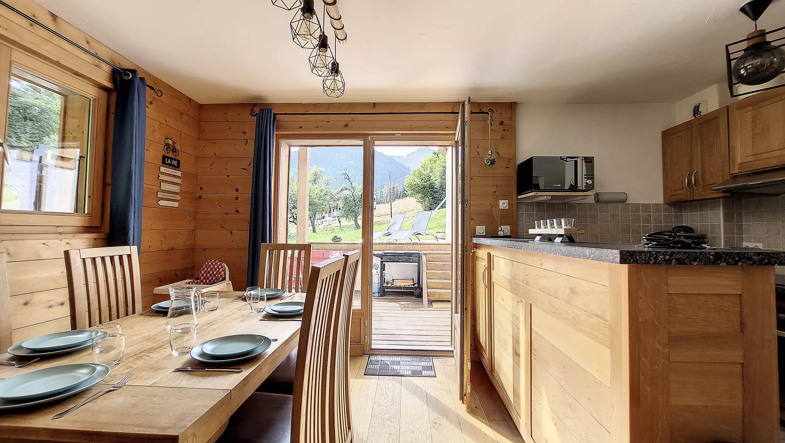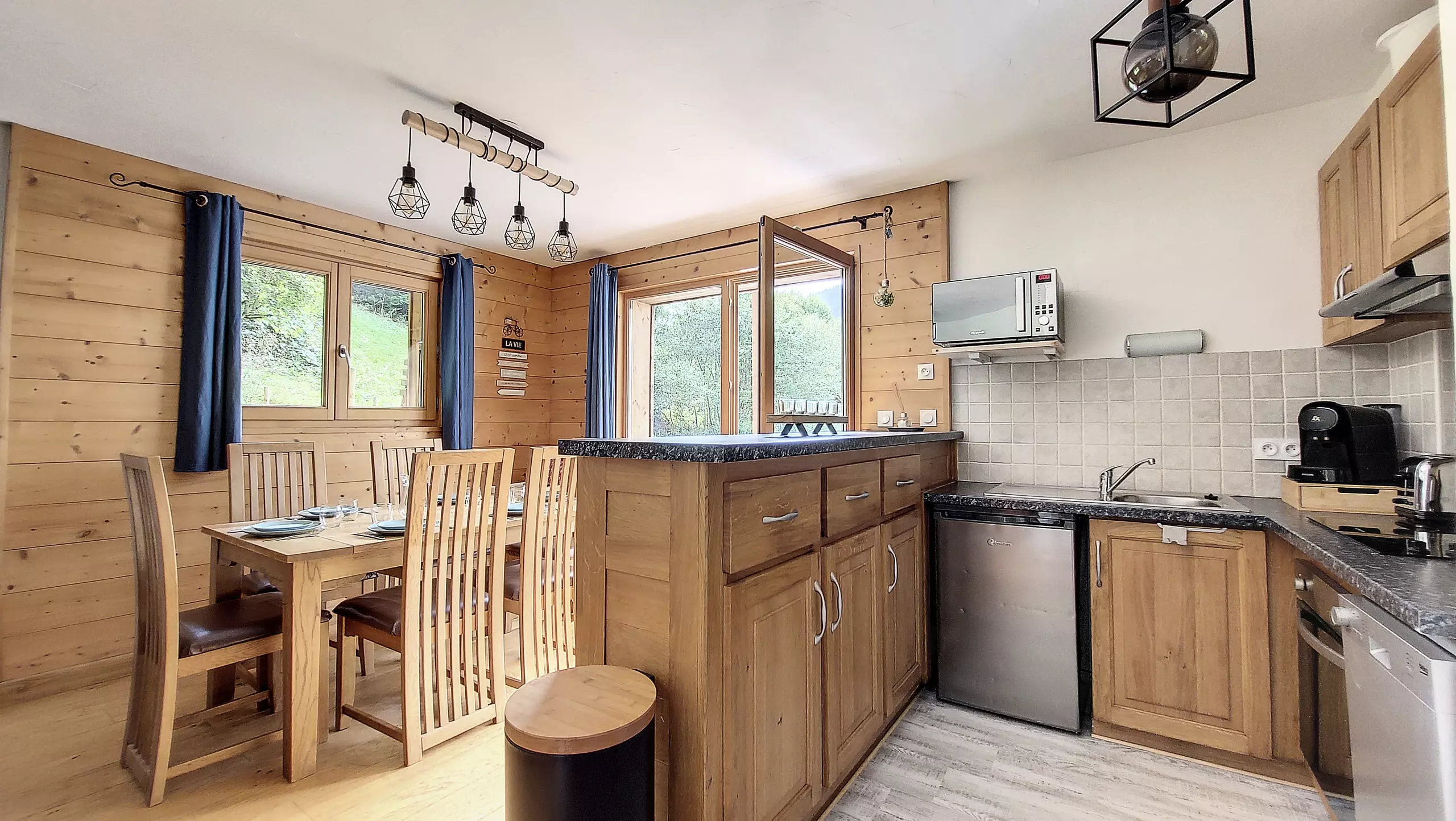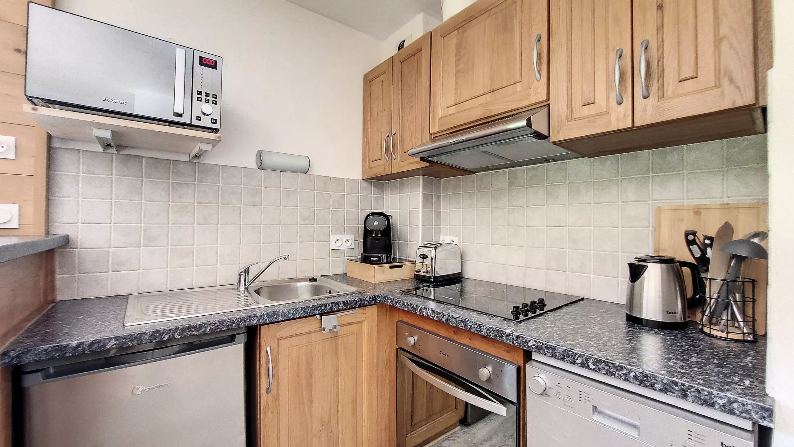 - Une cuisine tout équipée avec un évier, une hotte, une plaque induction, un four et un micro-onde encastré, un petit réfrigérateur avec une partie freezer, un lave-vaisselle, une machine à café nespresso, un four, une bouilloire, un grille-pain, un appareil à raclette qui peut faire pierrade, un appareil à fondue