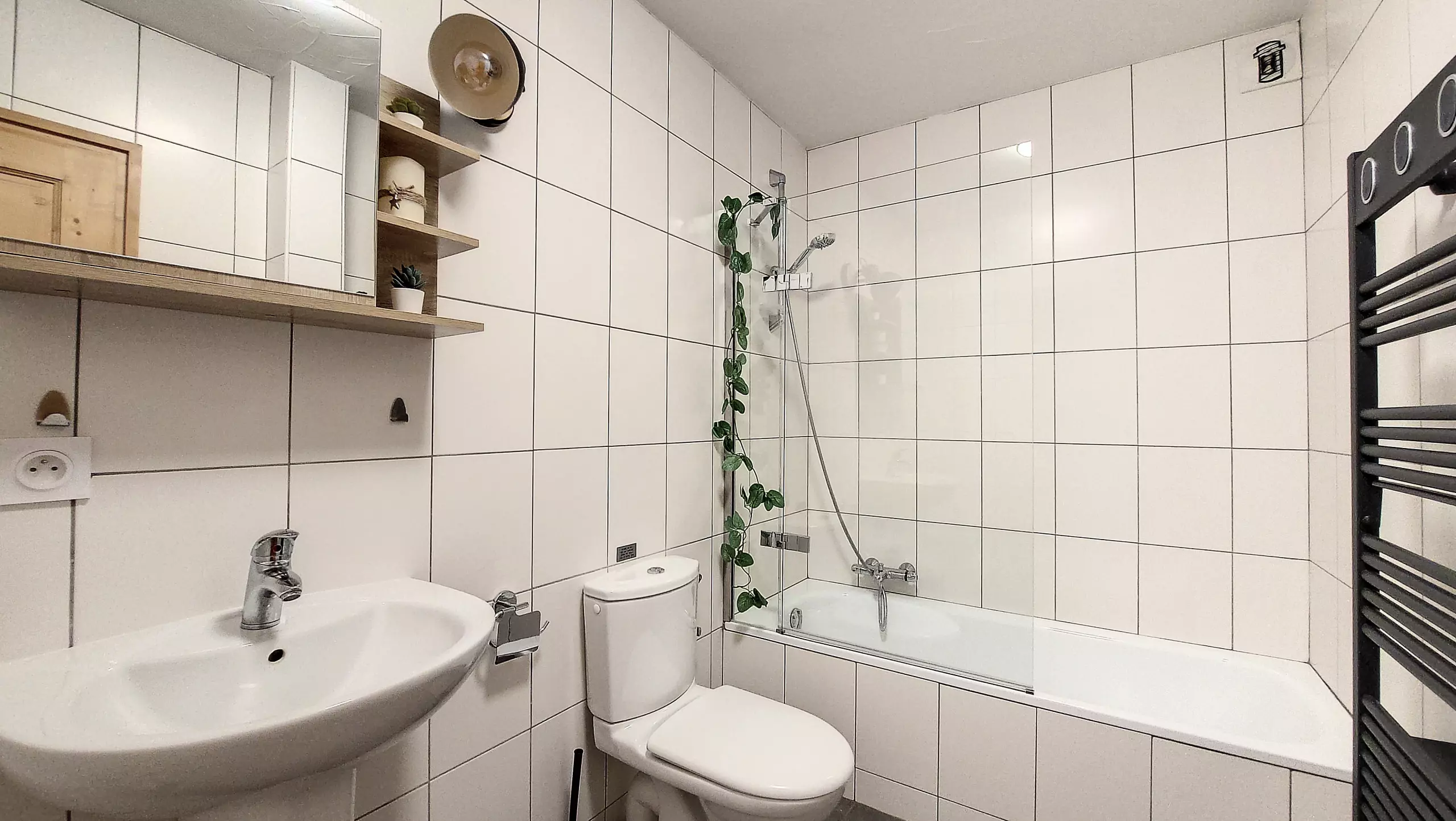- Une première salle de bain avec baignoire, 1 WC, une vasque, un sèche serviettes qui fait soufflant