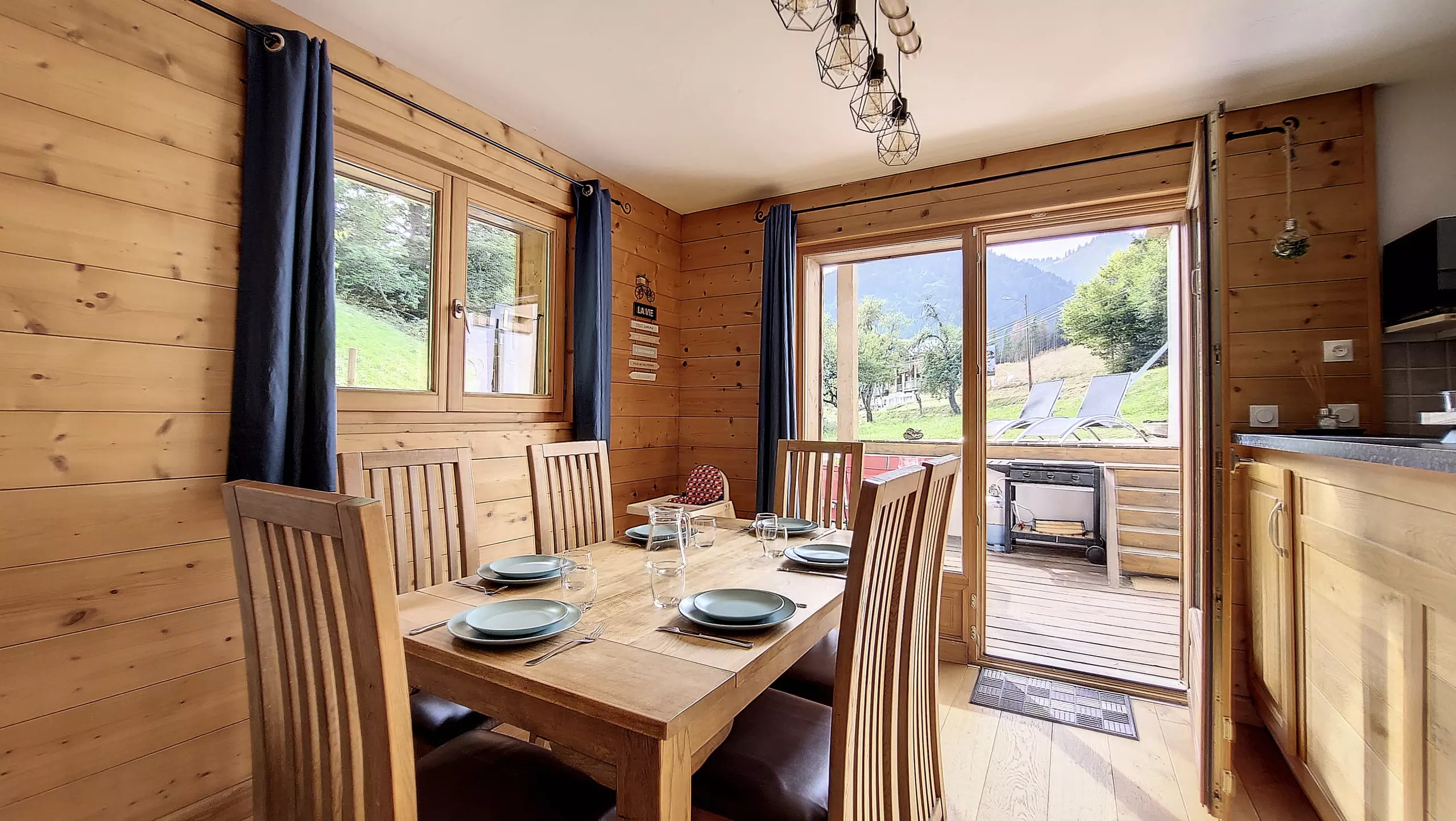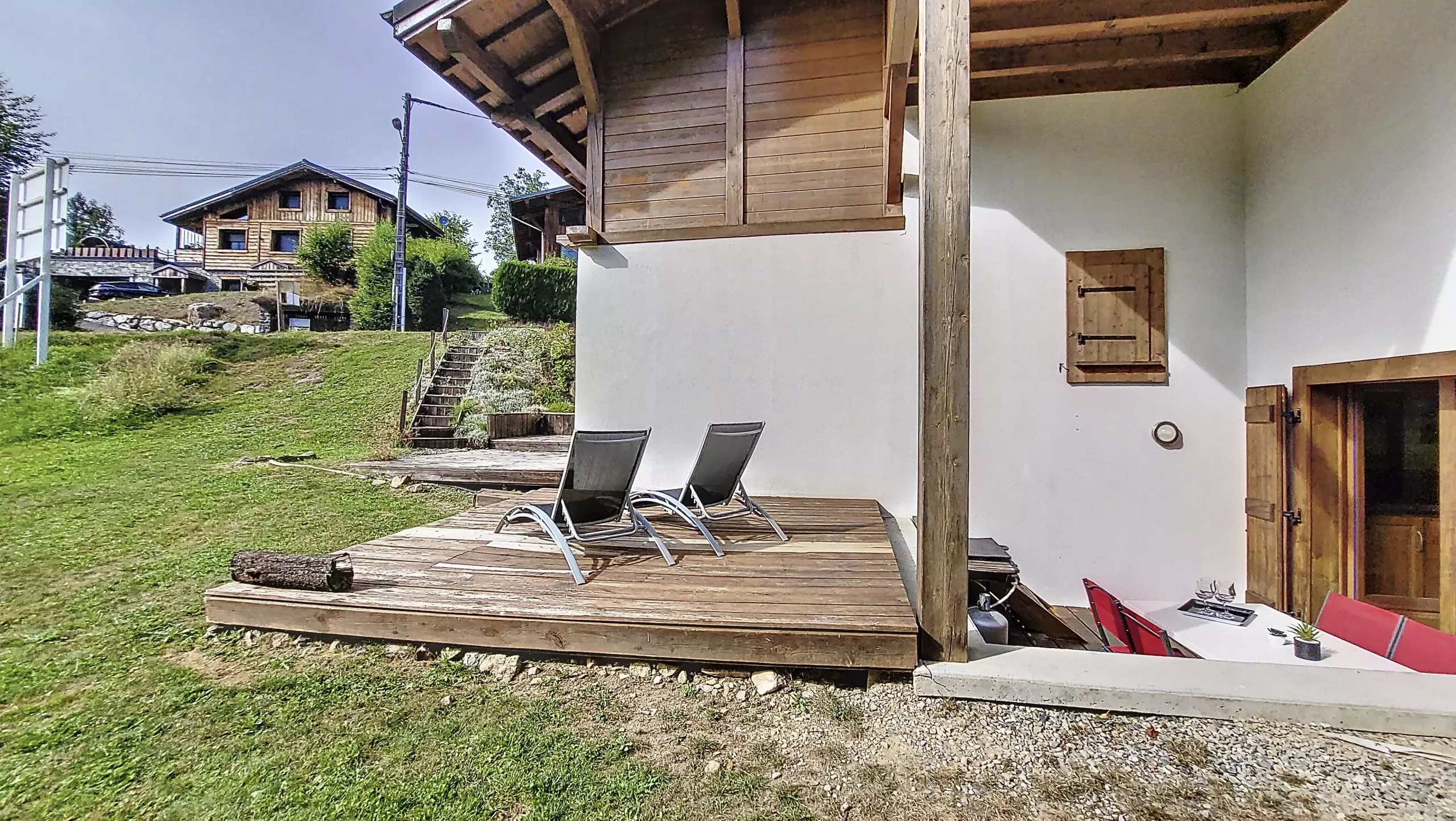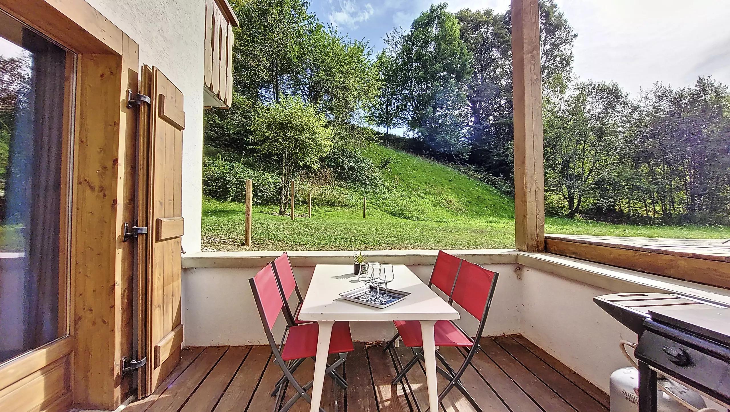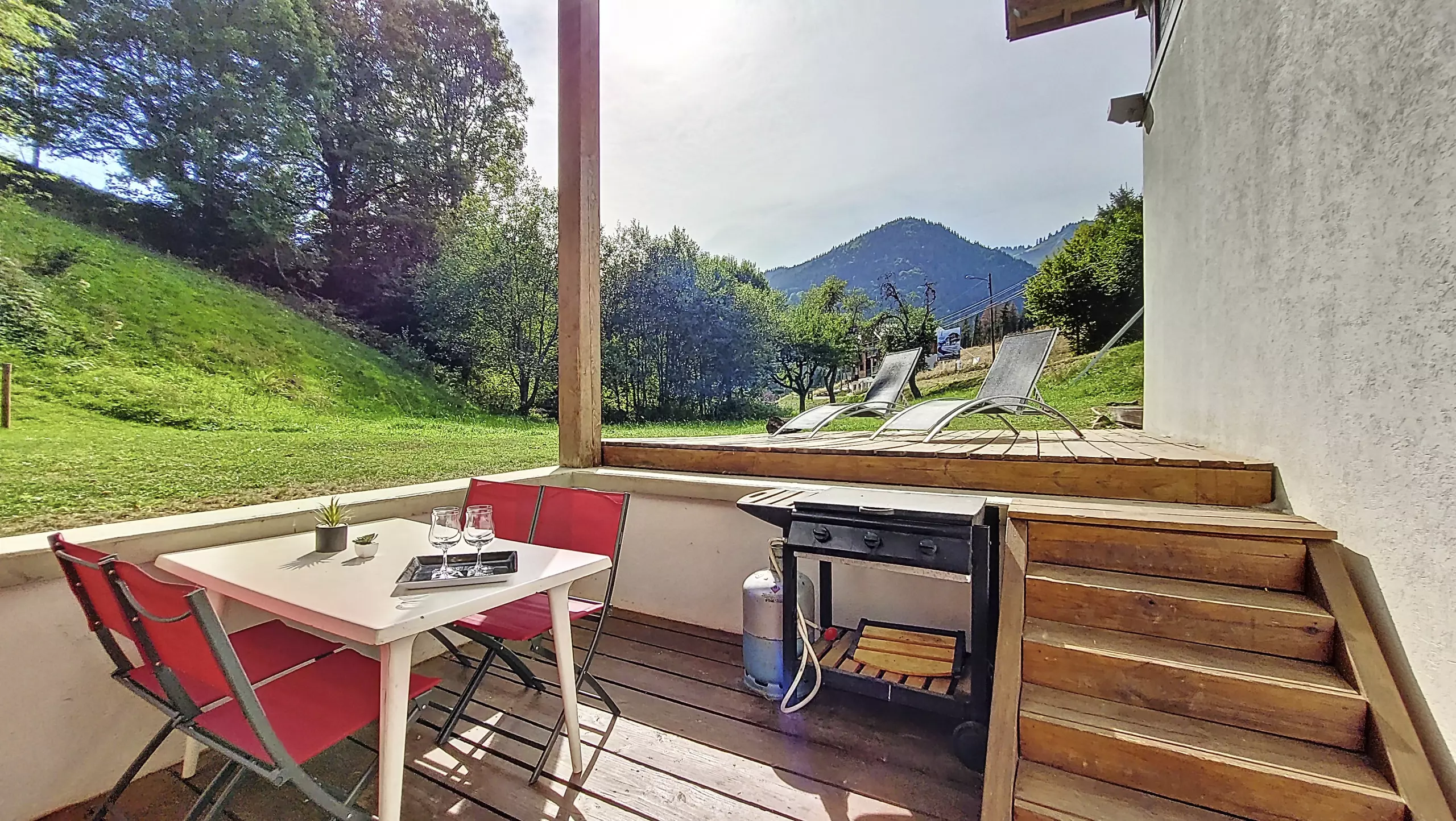 - Une terrasse sans vis à vis aménagée avec table, chaises, transats et barbecue pour l’été