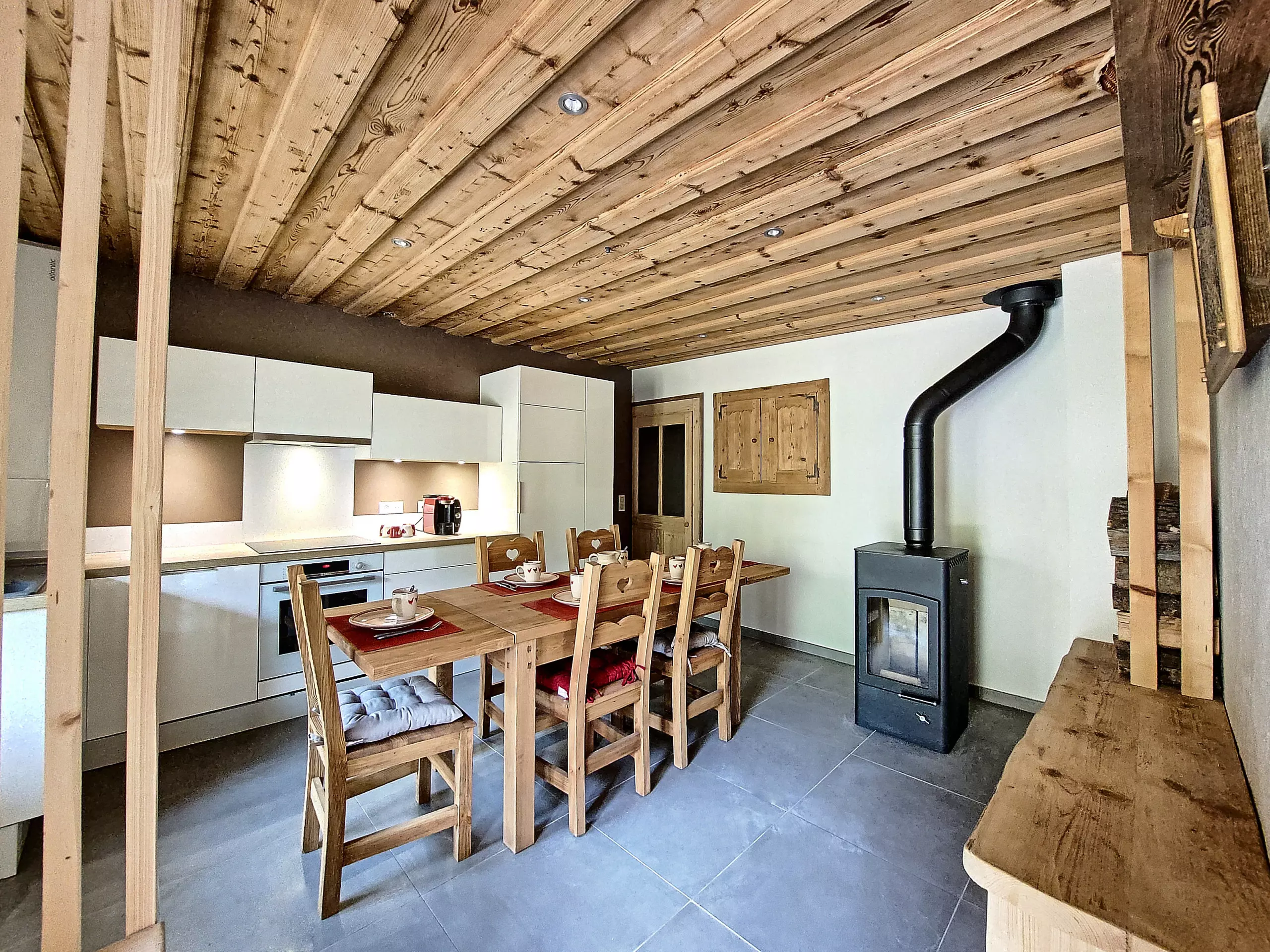 Une cuisine toute équipée avec plaque induction, lave-vaisselle, frigo et freezer, évier simple, hotte, four, micro-onde, bouilloire, grille pain, machine à café. Une salle à manger avec table, et 6 chaises. Il y a également un rangement pour les chaussures à ski sous le banc.