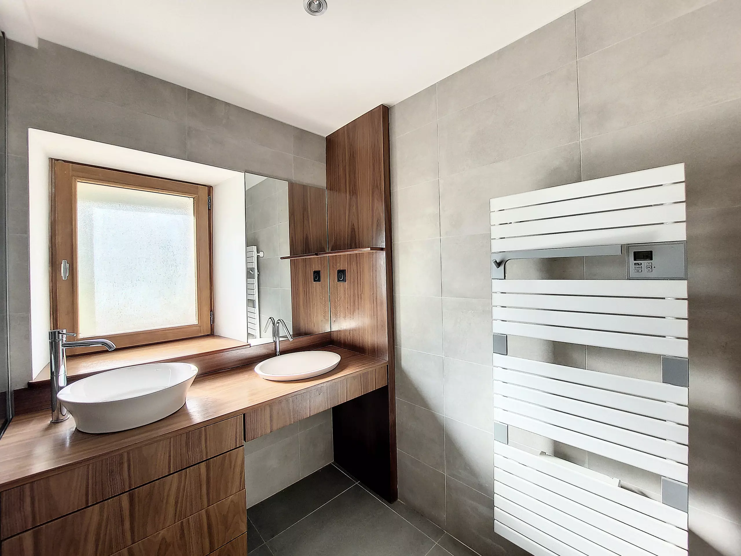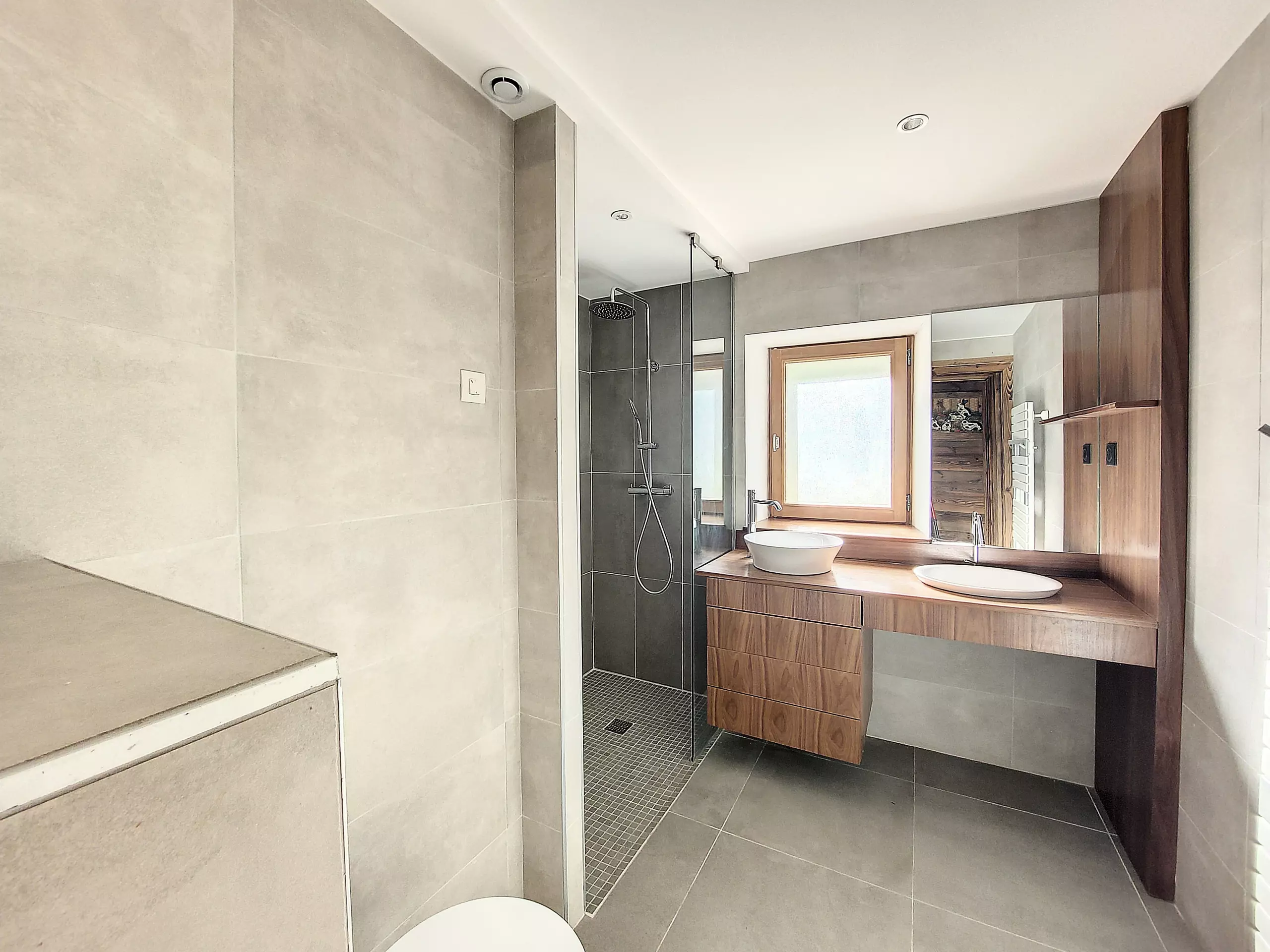 - Une grande salle de douche à l’italienne compatible PMR (personne à mobilité réduite), avec double vasque et rangement. Il y a aussi un sèche serviette et un WC.