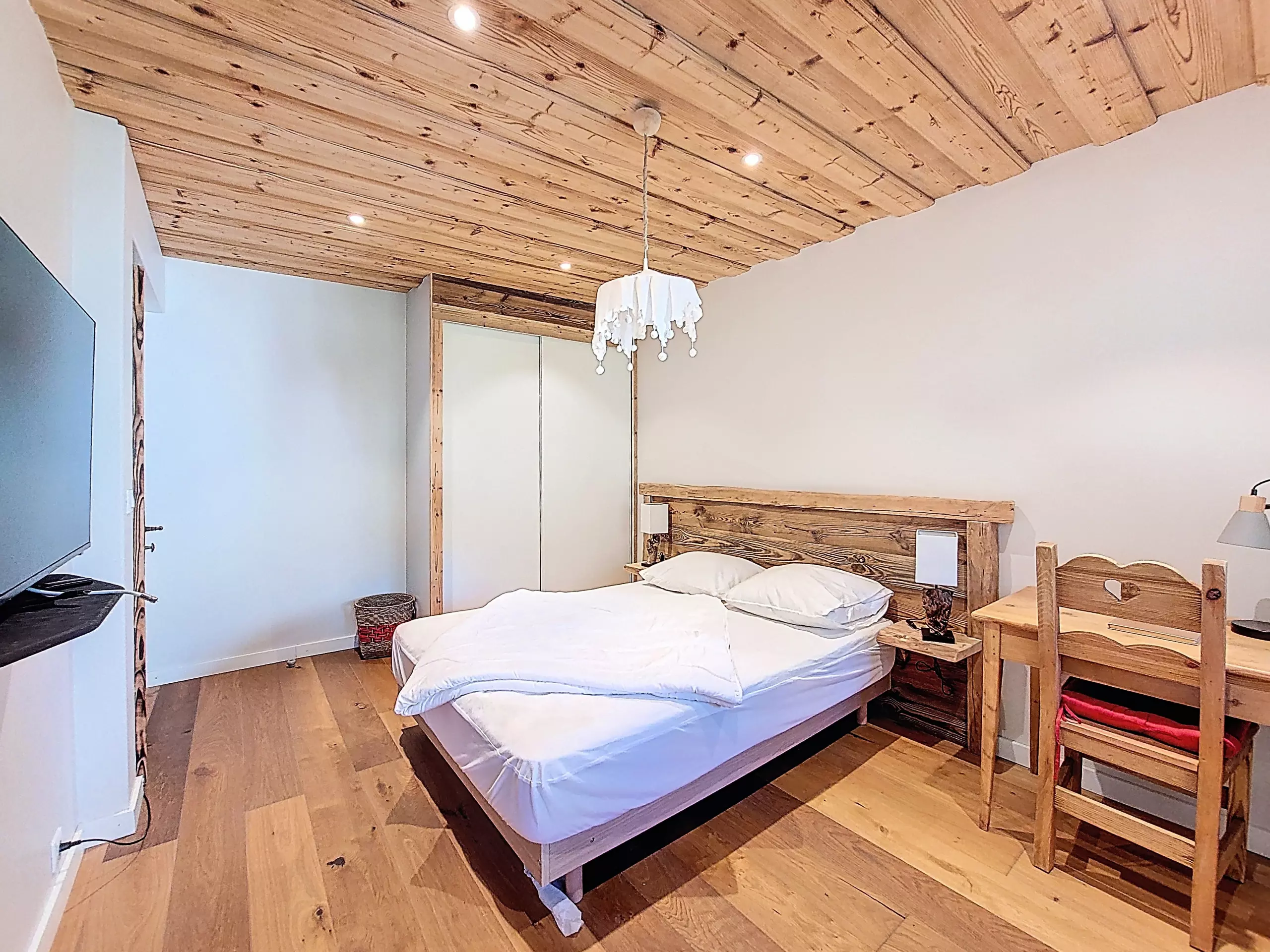 - 1 chambre spacieuse avec un lit double de (140x190) avec placard de rangement. Vue pistes de ski. Télévision et bureau.