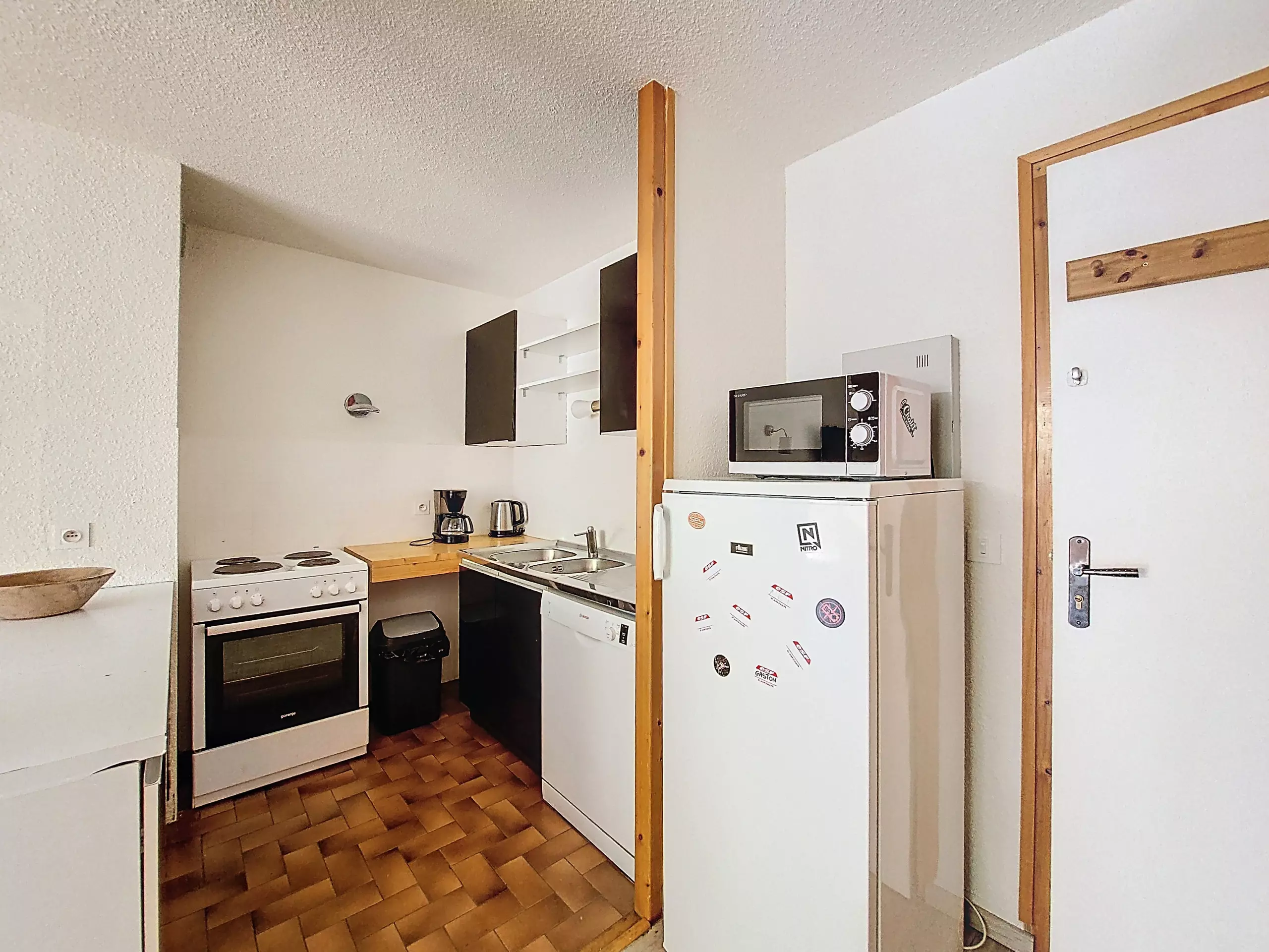 - 1 cuisine équipée (gazinière électrique, four, réfrigérateur, congélateur, micro-ondes, cafetière à filtre...).