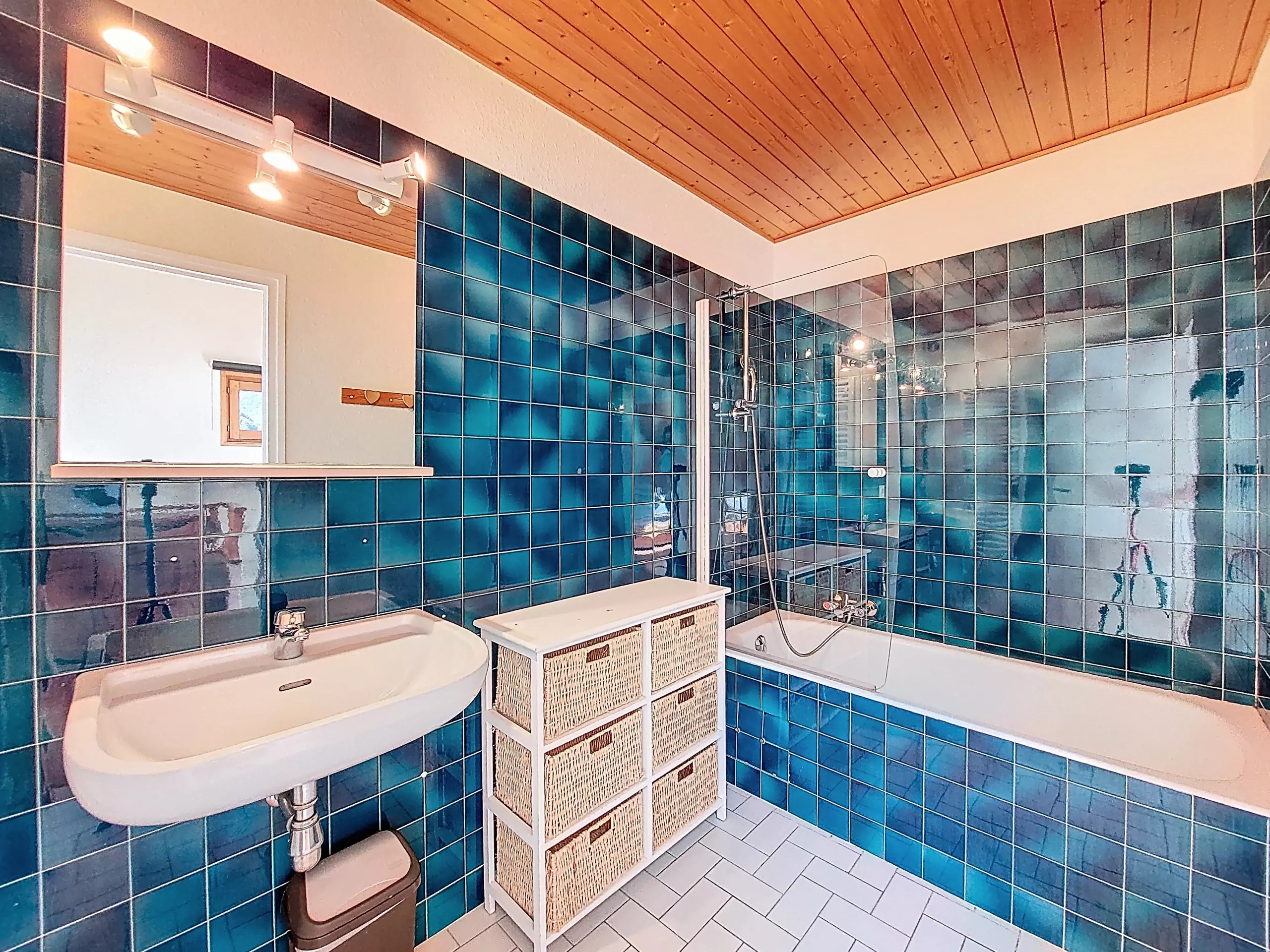 - Une salle de bain avec baignoire, sèche serviette électrique, lavabo et rangements.