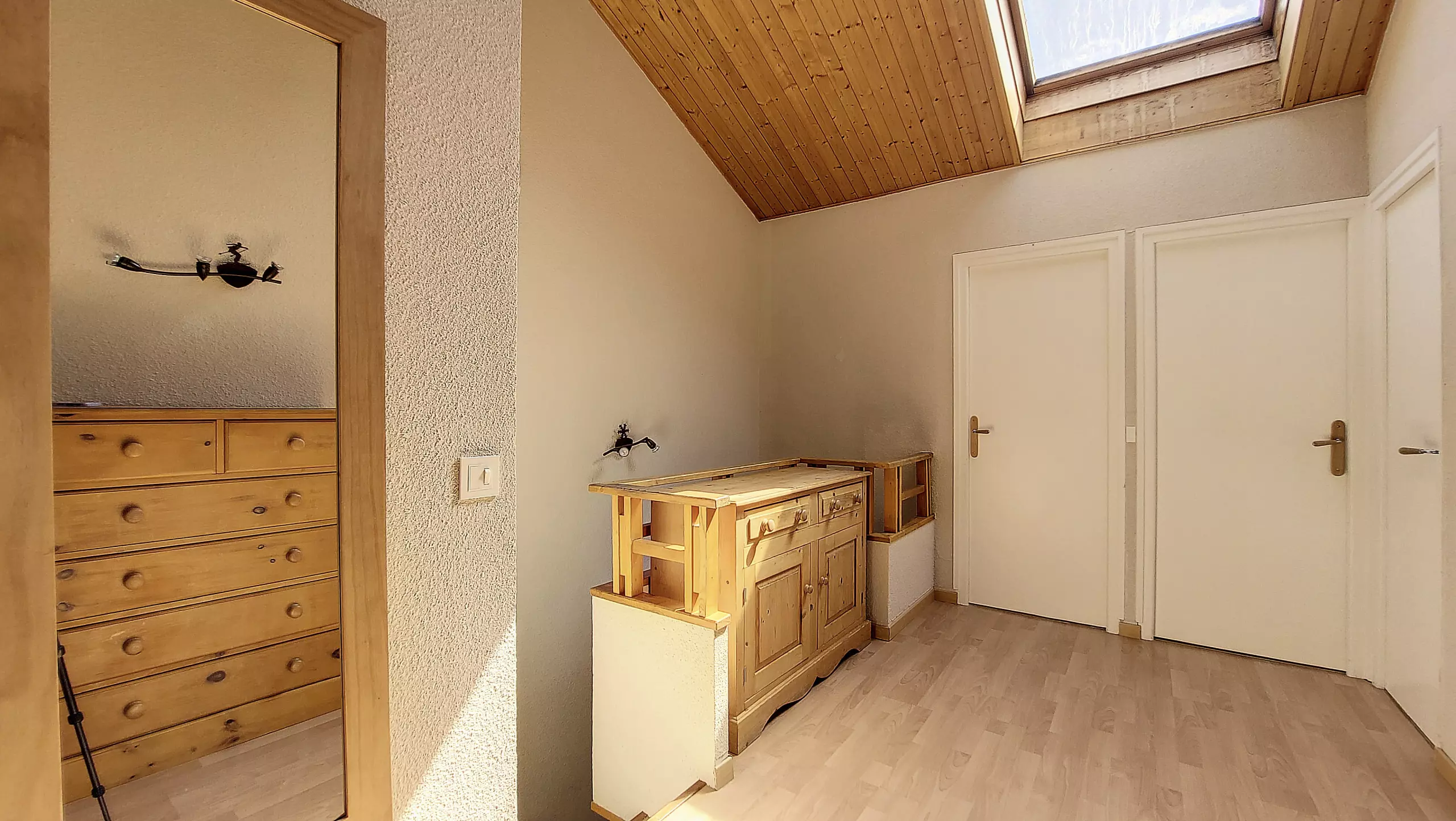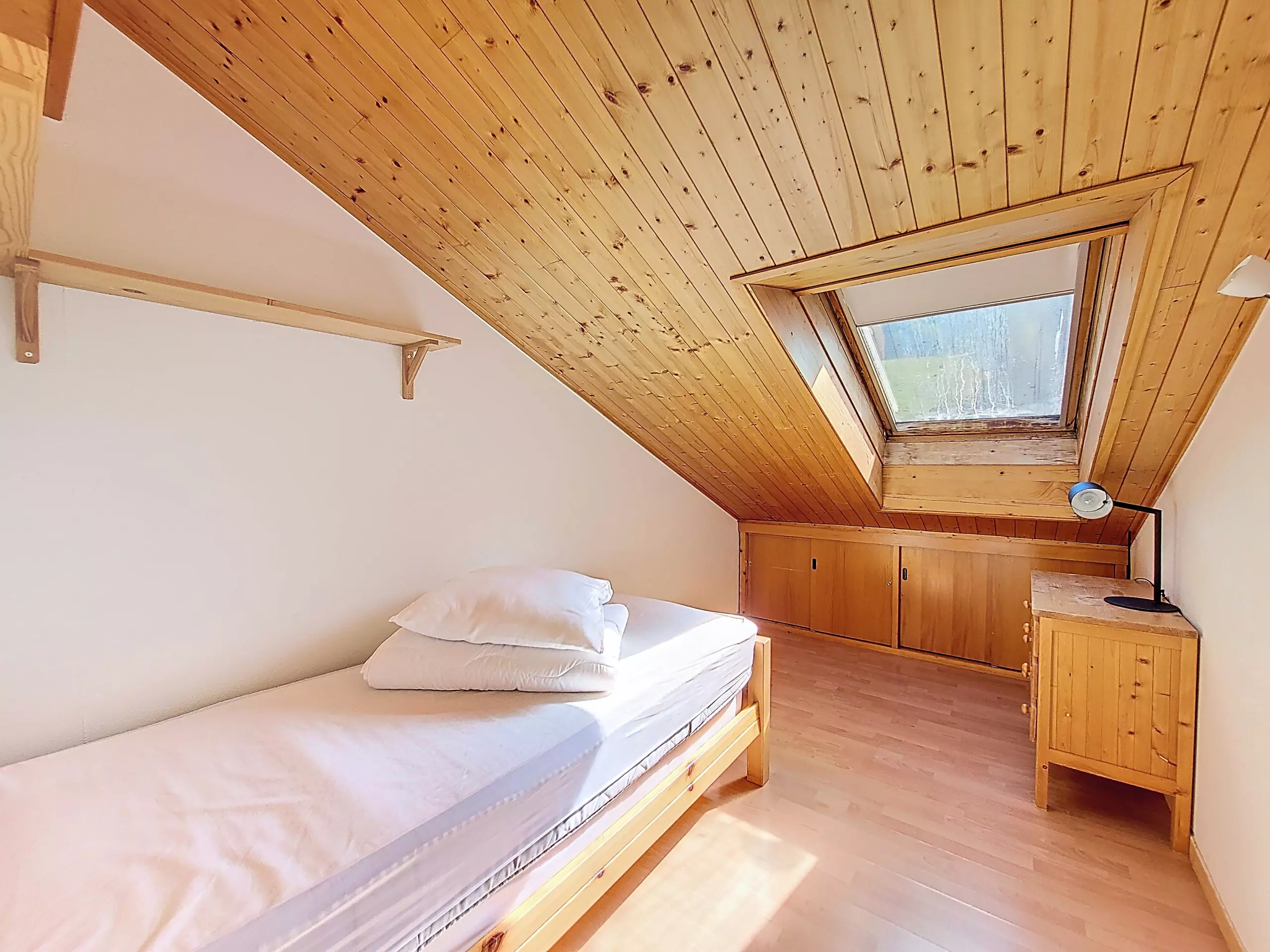 - Chambre n°1 mansardée (velux) avec 1 lit gigogne (soit 2 lits simples) et placard rangement sous les combles